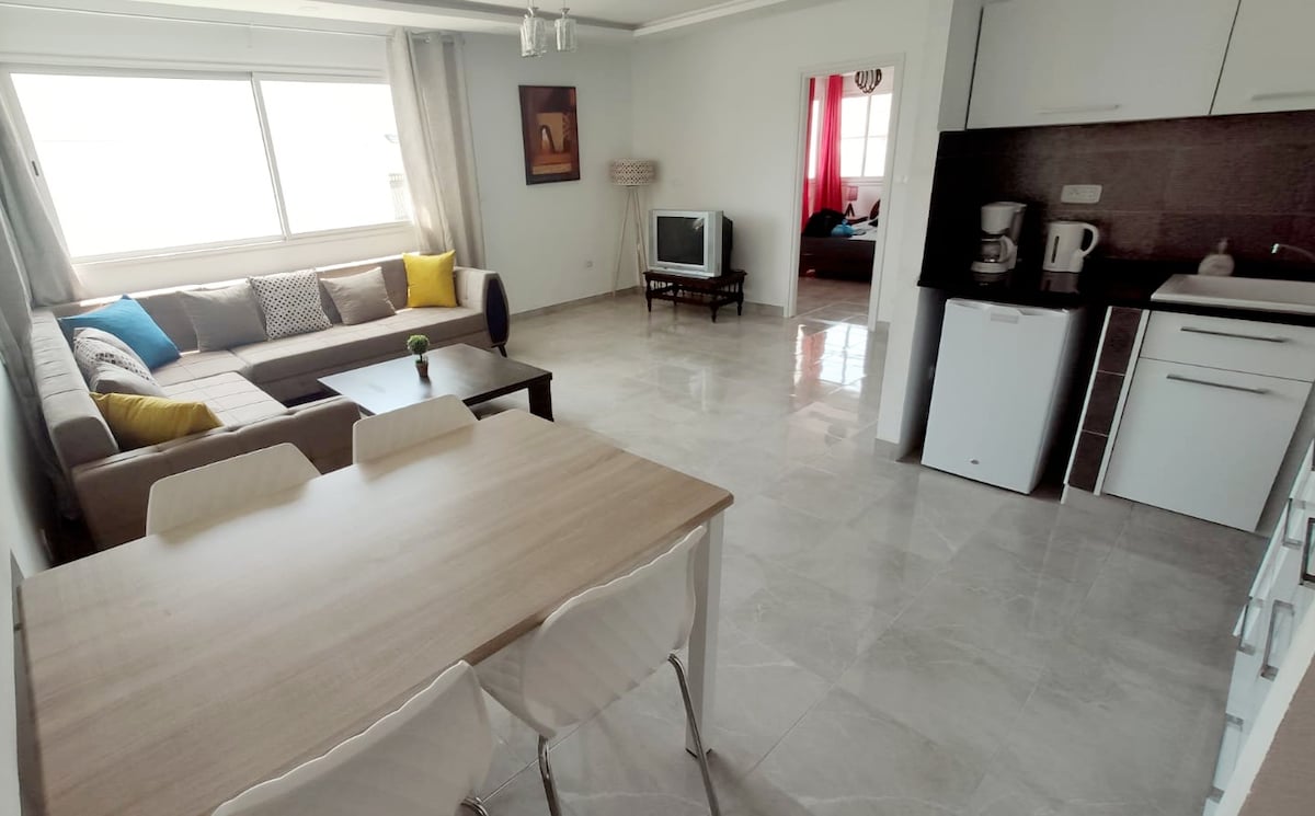 Denna fullt utrustade S+2 lägenhet erbjuder en modern och bekväm miljö, perfekt för din vistelse med familj, vänner eller som ett par. När du kommer in i lägenheten hittar du: Två rymliga sovrum med förvaring Ett ljust vardagsrum med Smart-TV och luftkonditionering Fullt utrustat kök (kylskåp, ugn, mikrovågsugn, redskap) Ett modernt badrum Centralt läge, nära till kaféer, restauranger och souken En kort promenad till stranden Höghastighets wifi och luftkonditionering i alla rum