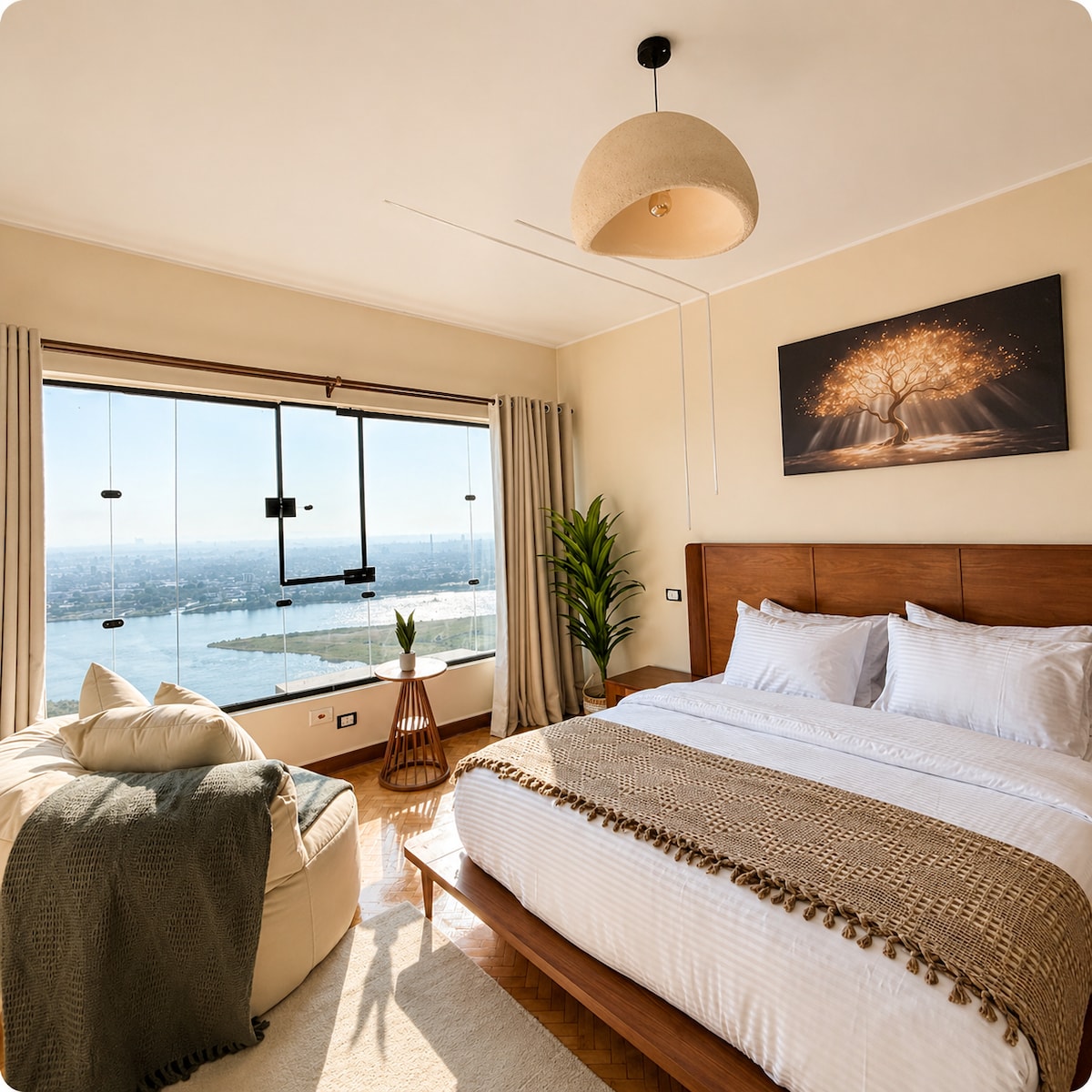 Välkommen till din frid Fantastisk utsikt över Nilen Vakna upp till panoramautsikt över Nilen, där soluppgången målar himlen i livfulla nyanser. Njut av ditt morgonkaffe på balkongen när du ser båtarna glida förbi *Rymlig och elegant inredning* Vår lägenhet är utformad med din komfort i åtanke. Förstklassigt läge #Bekvämligheter för alla behov fullt utrustat kök eller njuta av en filmkväll med vår smarta TV, vi har allt du behöver för en bekväm vistelse. Det ska bli så kul att få välkomna dig!