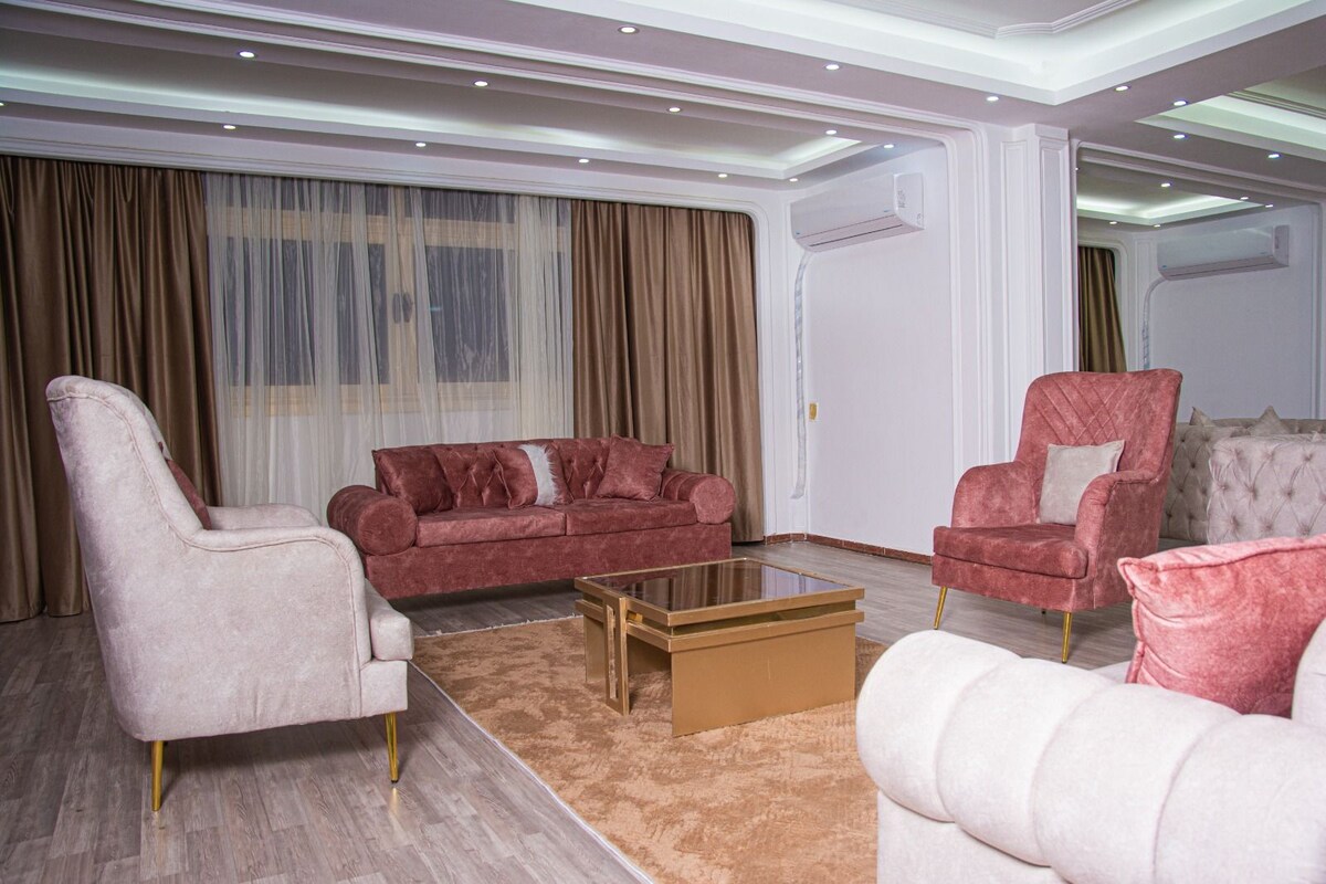 Ha kul med hela familjen och dina härliga vänner (gäster) på detta eleganta ställe. Fantastisk Nilvy lyx 3 Master sovrum som du kan njuta av solnedgången och pyramiderna. Njut av en elegant upplevelse på detta centralt belägna boende i nya torn, du kan njuta tillsammans med dina härliga gäster som känner sig helt bekväma inuti det eleganta huset # 10 minuter från centrum (Kairo-museet och Burj i Kairo ) # 12 min från Al Mohandessin # 20 minuter från pyramiderna