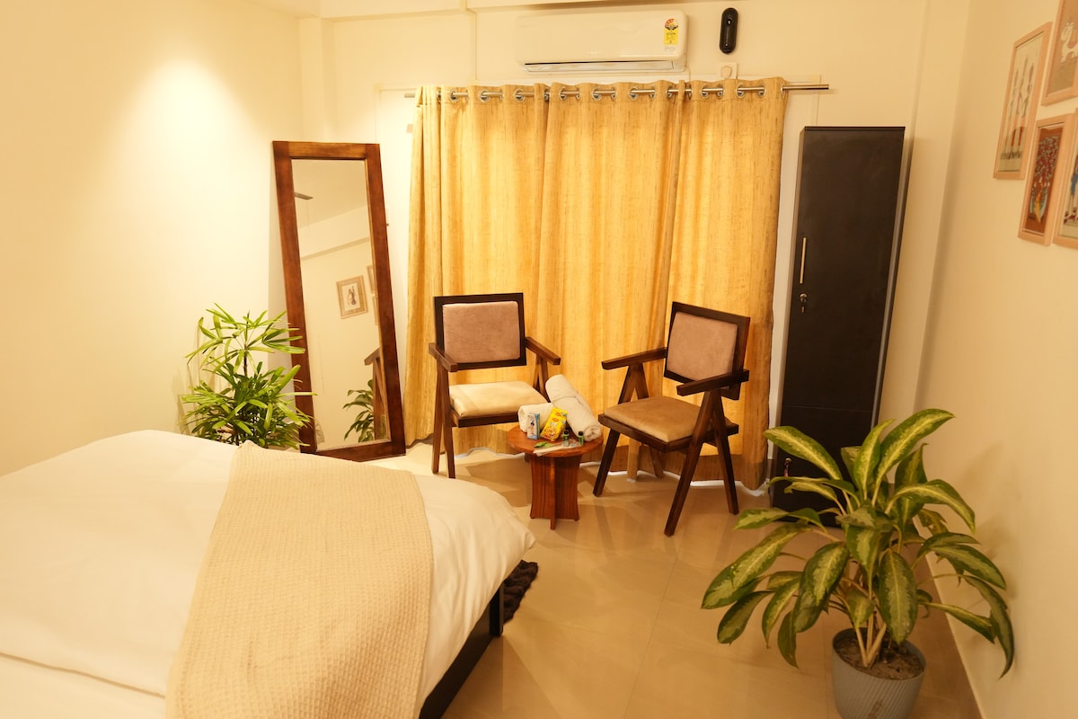 Njut av elegansen i vår 3BHK lyxlägenhet som erbjuder en perfekt blandning av komfort och sofistikering. Två dubbelsängar och en queen. Fullt luftkonditionerad Det rymliga vardagsrummet förvandlas till en hemmabio med en högkvalitativ projektor och skärm. Fullt utrustat kök, två designade badrum och två balkonger med fantastisk stadsutsikt för att fullända upplevelsen. Oavsett om du är i stan för att koppla av, arbeta på distans eller njuta av en mysig filmkväll är detta utrymmet utformat för alla.