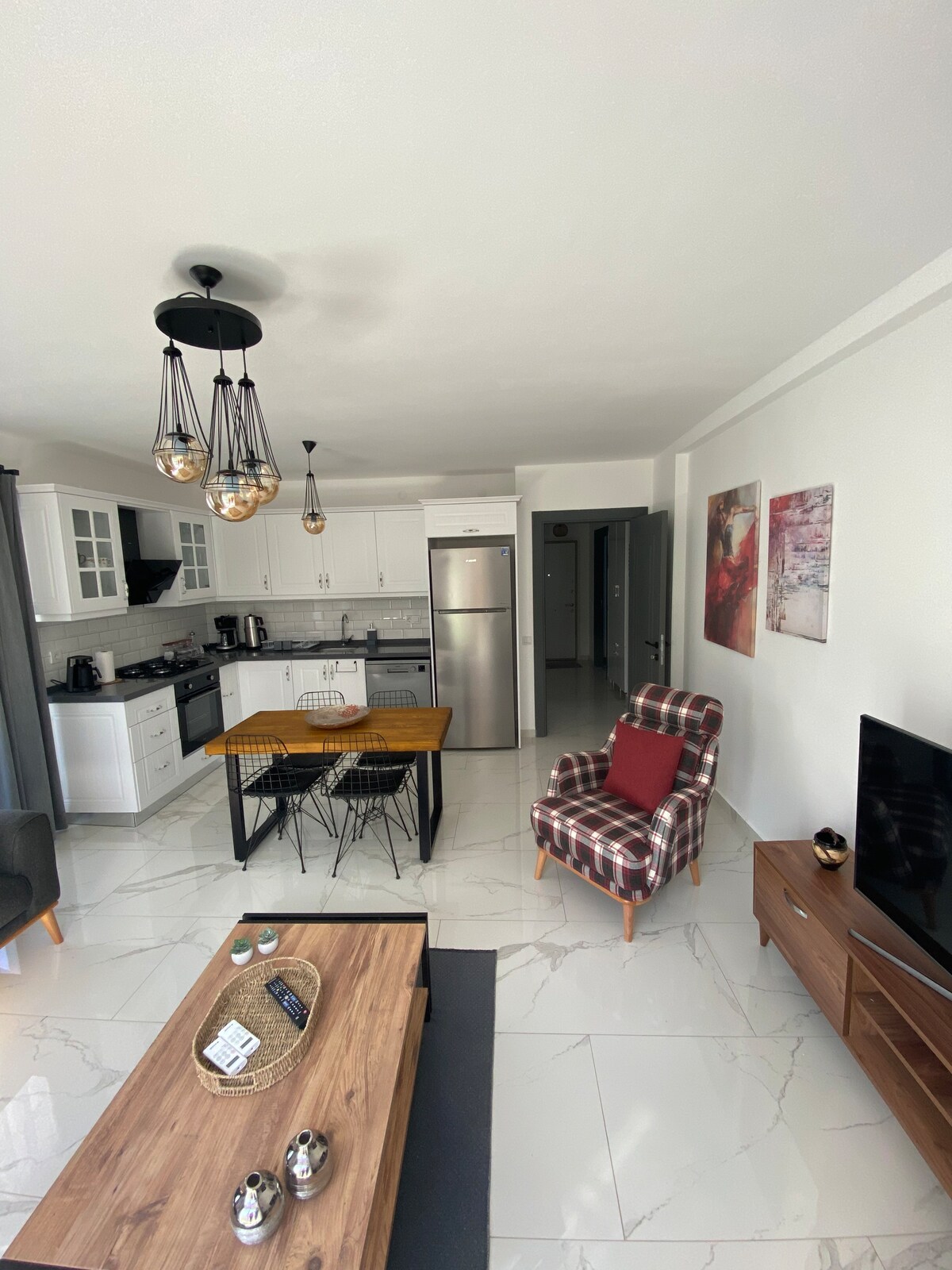 Vårt hem är möblerat med lyxiga möbler. Belysningen i huset stöds av moderna och eleganta lampskärmar.Huset ligger mittemot havet, Den främre balkongen har en havsutsikt och de två terrasserna på övre våningen har en utsikt över bergen. Vårt hus är 160 m2 och har 4 sovrum, 2 badrum och toalett. Det finns 2 TV-apparater, kylskåp och tallmaskin i huset. Huset har en hiss, en generator, en vattentank och en vatten booster, och har också ett inomhusgarage. Huset ligger 50-100 meter till stranden, Migros, café-restauranger, och marinan är 300 meter.