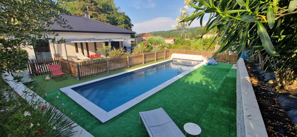 Hus med pool (15mx3,5) på landet, stor inhägnad park, boulesbana, annexrum. Perfekt för sammankomster för familjer eller vänner för gröna och lugna vistelser. Nytt: Annex med altan med panoramautsikt. 30 km från Saint Antoine l'Abbaye (favoritby i Frankrike 2025), 45 minuter från Chartreuse och Vercors berg. 1 timme från Lyon och Grenoble. Alla butiker 1 km bort.