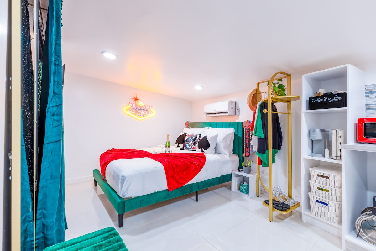 En mysig lägenhet med ett sovrum tillräckligt stor för att underhålla två gäster och ligger inom några kilometer till Hollywoods sevärdheter, affärer och stränder. Denna lägenhet har egen ingång och egen uteplats. Uteplatsen är utrustad med ett café bistrobord och två stolar för att njuta av ditt morgonkaffe. Lägenheten har en queen size säng med TV i sovrummet, pentry med mikrovågsugn, enkel brännare spishäll och ett fullstor kylskåp tillsammans med en parkeringsplats. Tyvärr inga husdjur tillåtna.