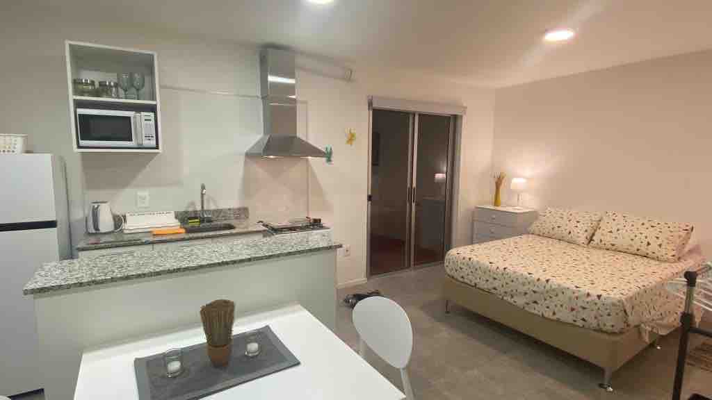 Central lägenhet för upp till 3 personer, mitt framför Plaza Entrevero. Mycket ljust enkelrum med integrerat kök, komplett badrum, en bädd (fällbar), bäddsoffa för två personer. Fullt utrustad för 3 personer: sängkläder (inklusive täcke), komplett uppsättning handdukar, porslin. 40-tums smart-TV, Netflix. WIFI. Luftkonditionering Ny byggnad, portvakt och hissar. Perfekt läge, mitt i Montevideo, ett halvt kvarter från huvudgatan (service och transport)