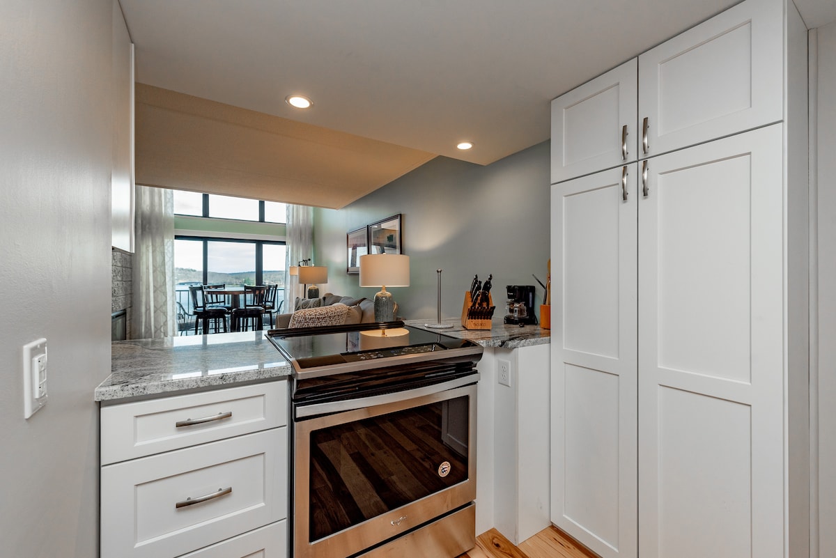 Enrumslägenhet med ett sovrum, ett badrum med egen uteplats, fullt utrustat kök, el- och vedeldade spisar. (Tillgång till hiss ingår) Hotellbekvämligheter tillgängliga för alla gäster: Inomhuspool och bubbelpool i delad våning, två matställen på plats, 240'sandstrand och bryggor, fitnesscenter, spelrum, racquetballbana, täckt parkering, gratis WIFI och en sjöutsikt med varje rum!