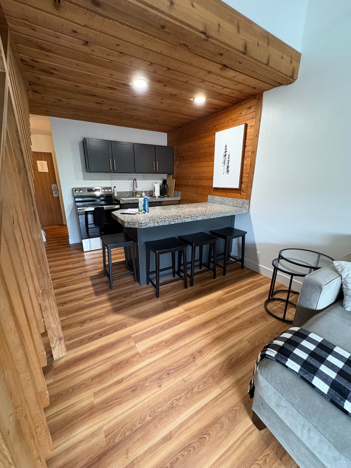 Valvad, lugn övre nivå 360 sf studio. Skidorter och Main St 5 min bort (ca. 1,5 miles bort). GRATIS buss tar dig till resorter/shopping. Övervakar Rail Trail & stream. Ombyggd och vacker! 50" HDTV, trägolv, gaskamin, kök, dubbelsäng (2 sovplatser) och bäddsoffa (1 sovplats). Bubbelpool öppen året runt. Poolen är öppen under sommarmånaderna. Restauranger inom gångavstånd. Måste gå upp en trappa. Jag vill att min studio ska kännas som ditt hem hemifrån!