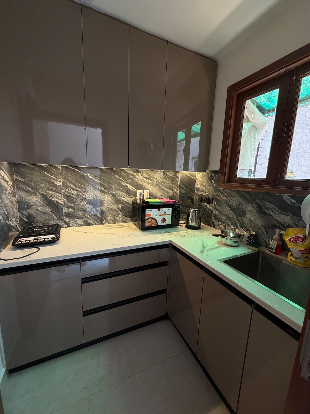 ➽ Rymlig 1BHK-lägenhet med en ansluten uteplats, fullt luftkonditionerad. Alla rum har 1,5 tons luftkonditionering. Fastighet med➽ solutsikt i ett grannskap med hög inkomst, öppen på tre sidor, med utsikt över parken och väl ventilerad med gott om naturligt ljus och frisk luft. ➽ Avancerad projektor med 25 W soundbar och Amazon FireStick med OTT-appar. ➽ Fullt utrustat kök med väsentligheter för bekväm matlagning. ➽ Koppla av på den fantastiska privata terrassen med omgivande ljus och unikt Foger-system för att kyla uteplatsen