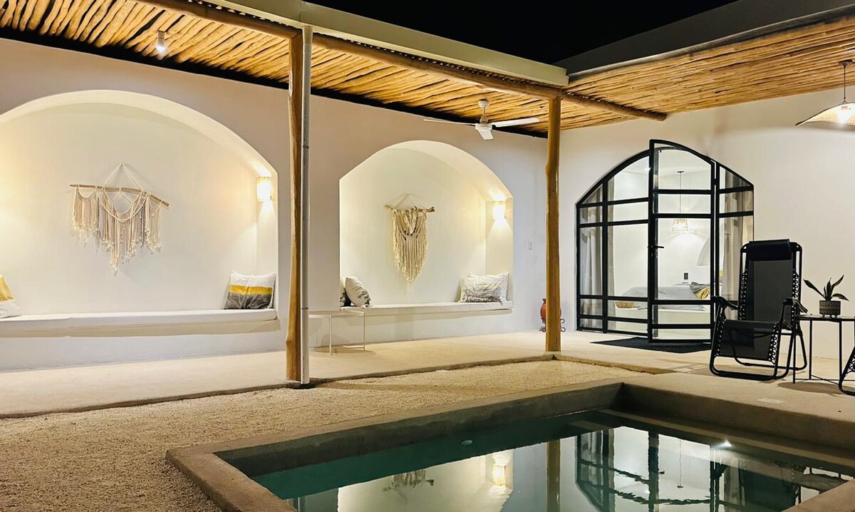 Perfekt för strandälskare och matälskare! Vår eleganta lägenhet några minuters promenad till stranden, 9 fantastiska restauranger, ett kafé och en liten livsmedelsbutik. Detta fridfulla utrymme ligger i eftertraktade Las Palmas och har välvda tak, luftkonditionering, skuggad terrass och en fantastisk pool. Det finns gott om gratis parkering på plats och en säkerhetsvakt på kvällen. Om de datum du vill ha inte är tillgängliga kan du kolla in vår identiska lägenhet i samma komplex! Klicka bara på min värdprofil för att se boendet.