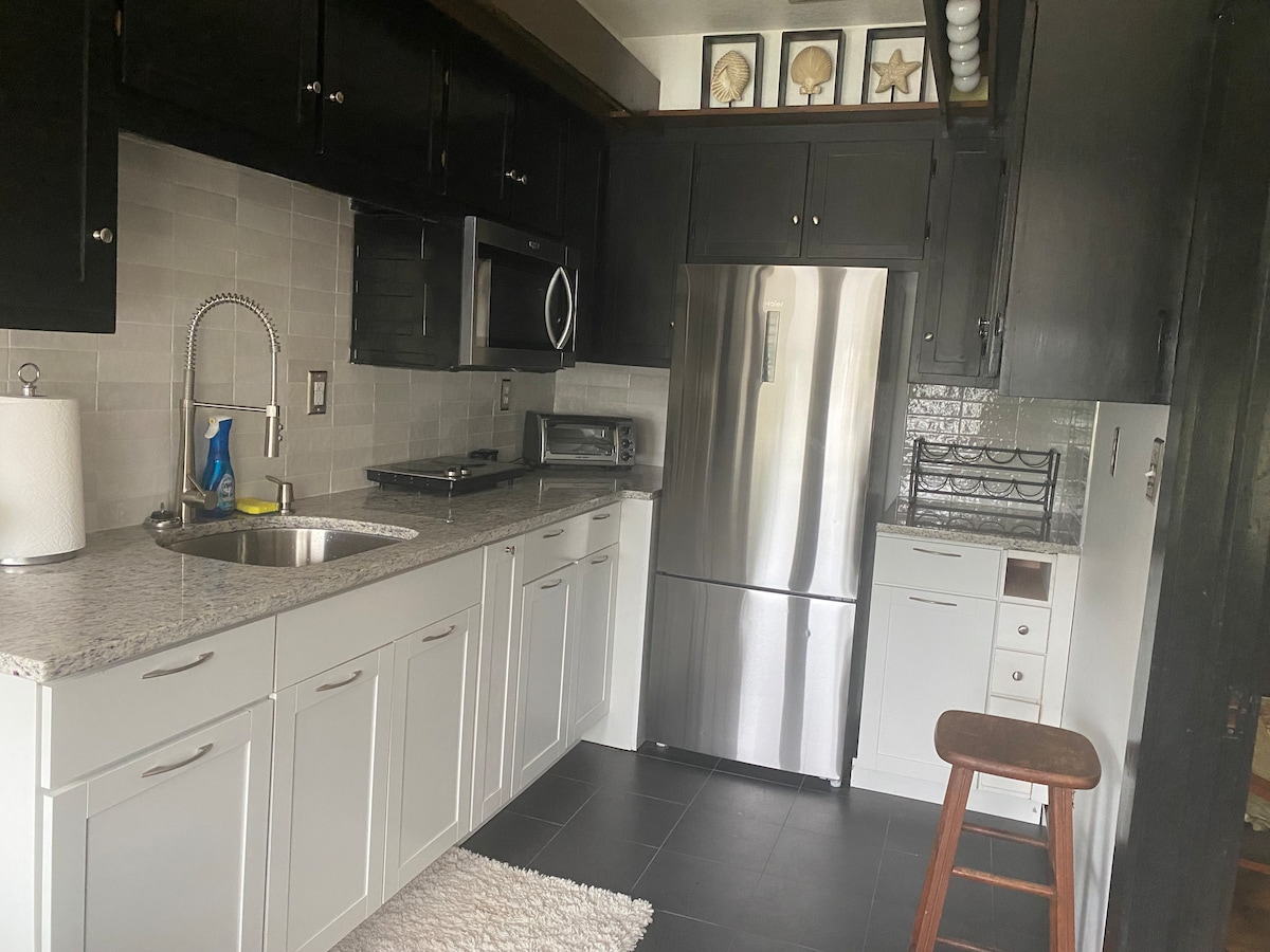 A private home, 2 bedrooms with queen sized beds in each, a shared bathroom between the two bedrooms. Washer and dryer on premise. Ample parking in driveway. Small cement patio in back of the house, accessible through sliding glass door. Small kitchen with new appliances, kitchen table with 5 chairs. Leather couch with reclining seats, two leather reclining chairs. House has well water, which has been tested, and safe to drink