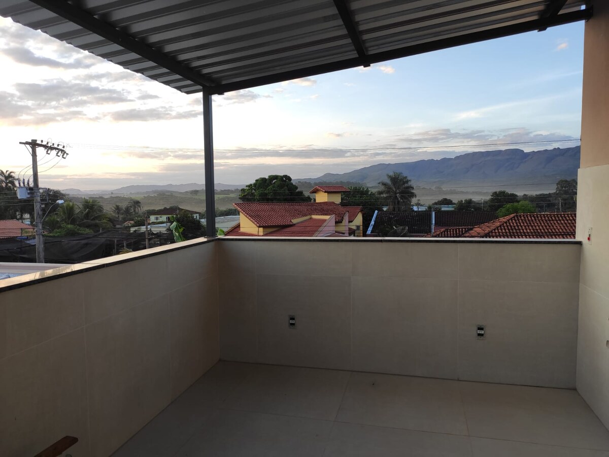 RYMLIGT HUS MED MYSIG BALKONG FÖR ATT BEUNDRA SOLNEDGÅNGEN OCH SERRA DA CANASTRA. SIMBASSÄNG OCH GOURMETOMRÅDE 3 km vattenfall 1 svit med luftkonditionering + 4 sovrum, alla med luftkonditionering, 3 badrum totalt, kök med alla redskap, toalett, 2 grillar, bryggeri, TV, Wi-Fi, vardagsrum, täckt garage. Det ligger i centrum av staden, nära butikerna. Värdet för att inkludera sängkläder och badlakan kombineras separat.