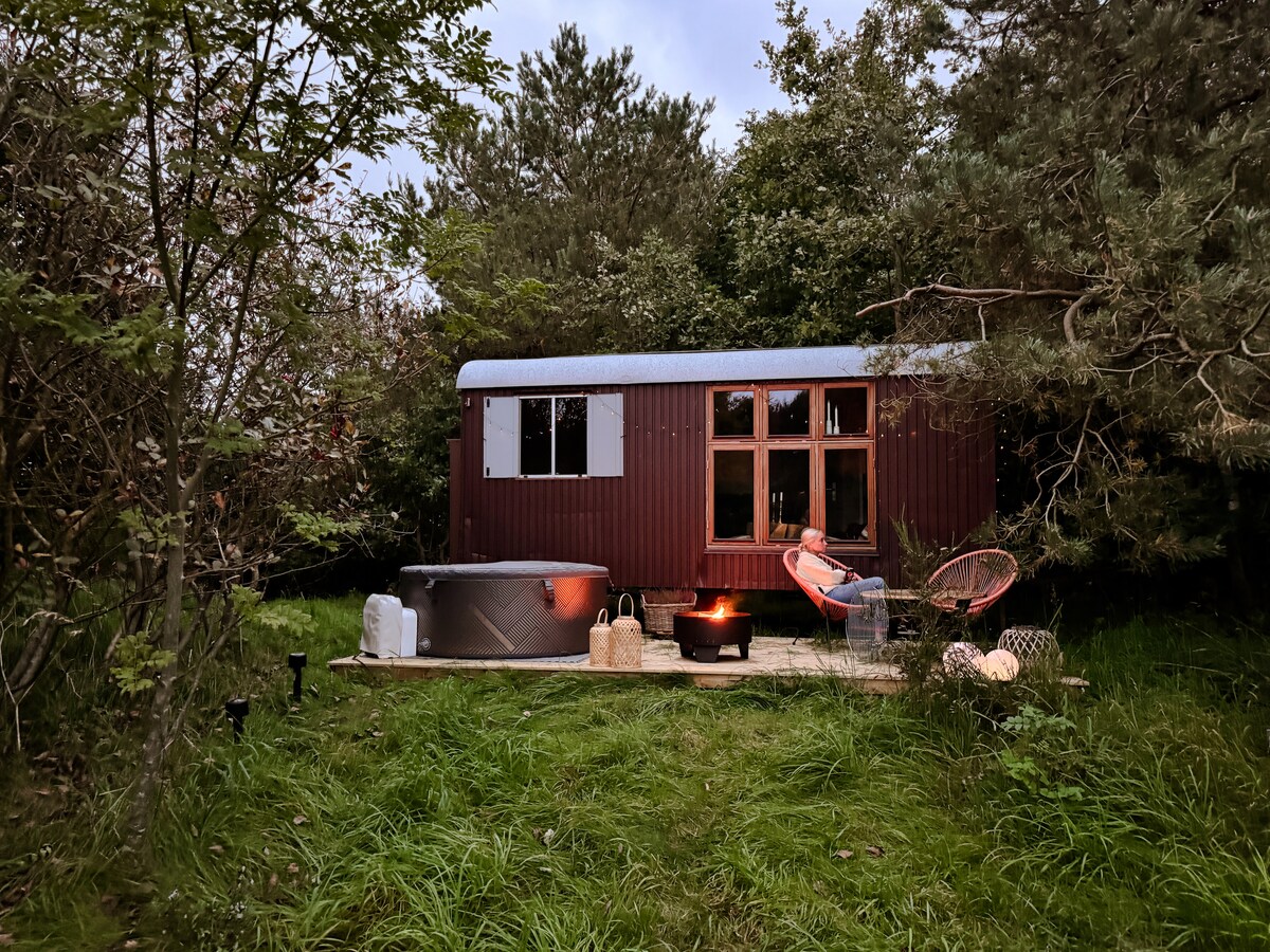Upplev en autentisk biodynamisk gård och fågelreservatet öl från en liten, mysig trästuga på hjul. Bjud in din partner, familj eller vän i naturen och hör låten sjunga från din terrass. Förbered våra biodynamiska produkter på din gasolgrill och ta något kallt att dricka från ditt kylskåp. Besök fågeltorn till fots några kilometer från vagnen. I slutet av dagen i gott sällskap under stjärnorna. Vi kan knappt vänta på att få vara din värd:)