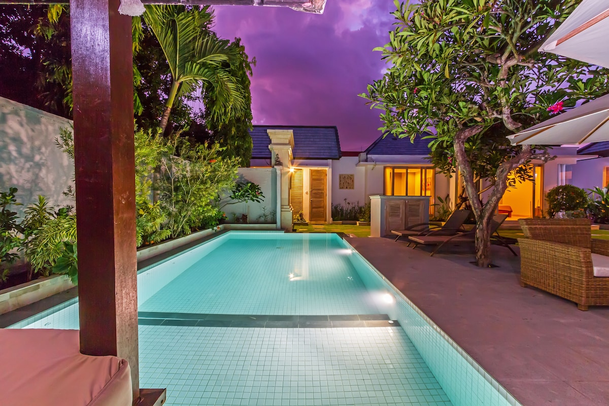 Solara Villa, 2 sovrum, 2,5-bad helt ny villa, belägen bara 150 meter från stranden, är redo att välkomna dig med våta handdukar, färskt kokosvatten och lokala sötsaker! Höjdpunkter : ✔ Frukost (Frivilligt) ✔ Mycket nära till stranden och IKONEN BALI ✔ 2 sovrum ( med balkong) ✔ Fullt utrustat kök ✔ Mysigt vardagsrum ✔ Smart-TV, Wi-Fi ✔ Dricksvattendispenser ✔ Trädgård (pool, dusch, solsängar, poolbar) ✔ Fri parkering ✔ Luftkonditionering ✔ Barnvänligt! Läs mer nedan!