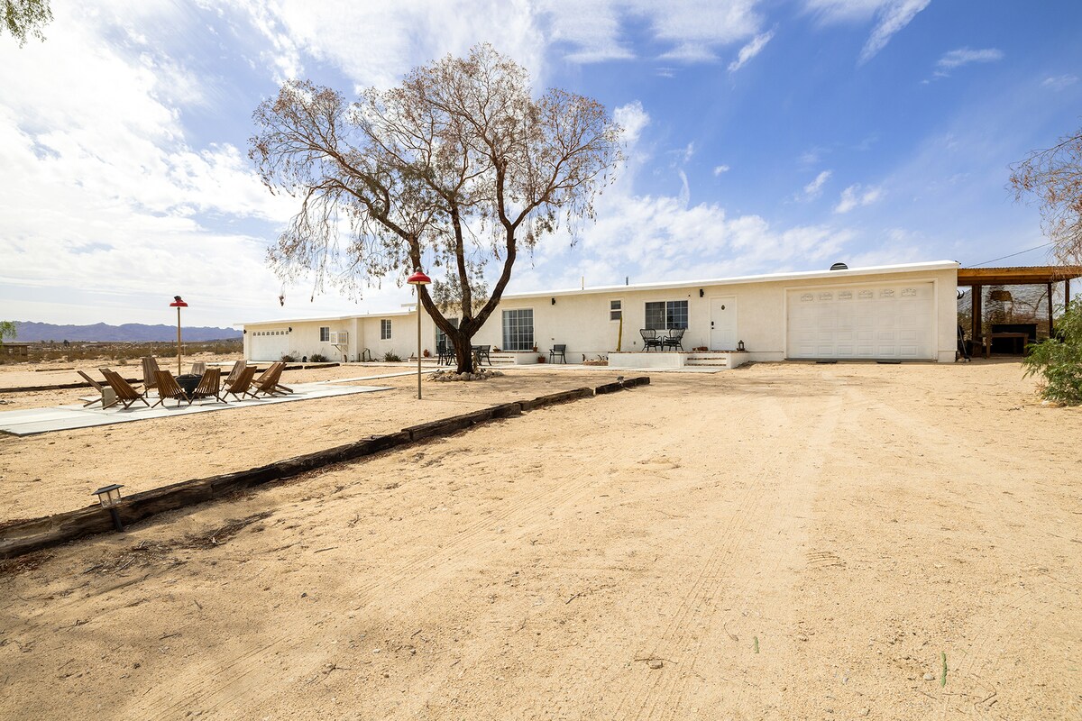 Vi har skapat ett speciellt privat boende för din avkoppling och njutning! Njut av stjärnskådning på alla delar av boendet! Lyssna på musik med skivspelaren! Fördjupa dig i 6-personers spa med LED-belysning efter en trevlig dag i Joshua Tree Park allt i total integritet! Njut av grillen under den täckta uteplatsen och titta på solnedgången! Båda utomhuseldgroparna är perfekta för avkoppling och för att hålla värmen medan du tittar på stjärnorna. Njut av det ultimata spelrummet! **Tesla väggladdare tillgänglig!