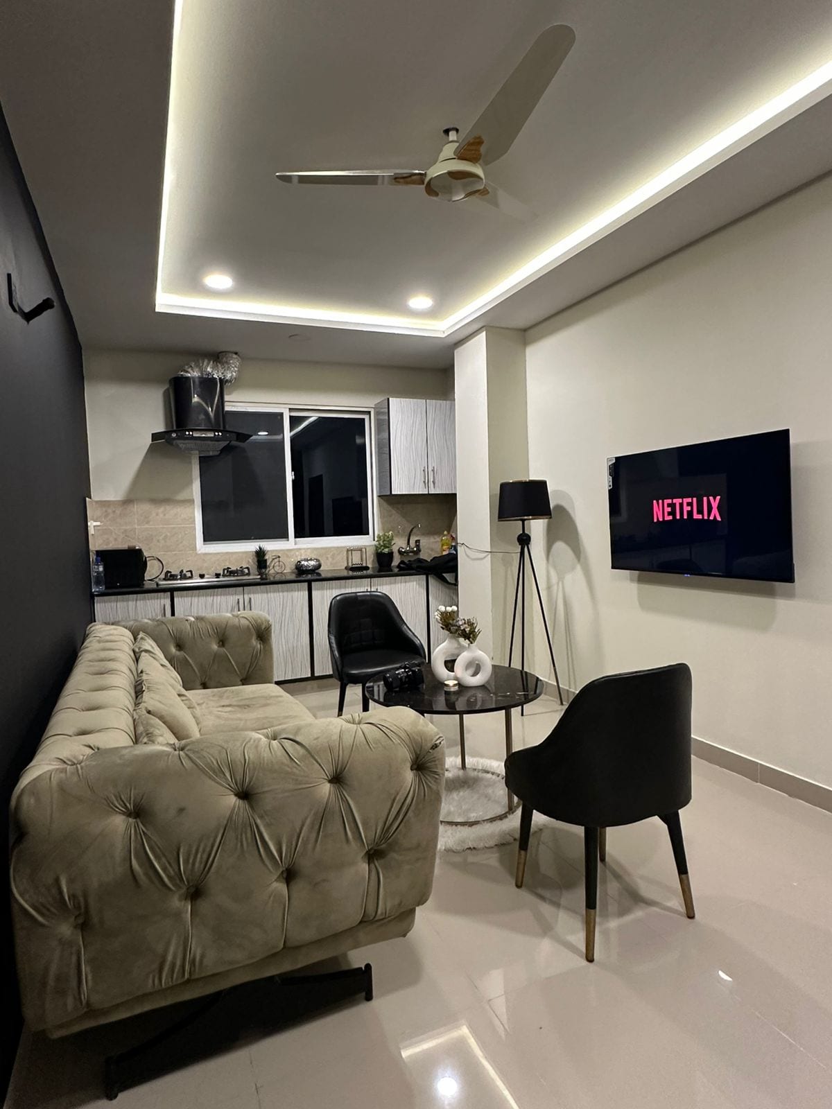 Ljus och modern 1-rumslägenhet i Rawalpindi med snabbt wifi, gratis parkering och självincheckning. Perfekt för par, digitala nomader och familjer på upp till 4 personer! Bara några minuter från kaféer, restauranger och bekvämligheter i Bahria Heights. Njut av en bekväm kingsize-säng, en 8-sitsig soffa och en dedikerad arbetsyta. Gratis parkering Snabbt wifi + arbetsyta Självincheckning/nyckelskåp Dubbelsäng (king) + soffa/lounge-område Nära restauranger och kaféer Utmärkt för barnfamiljer/affärsresenärer Säkerhet i byggnaden dygnet runt