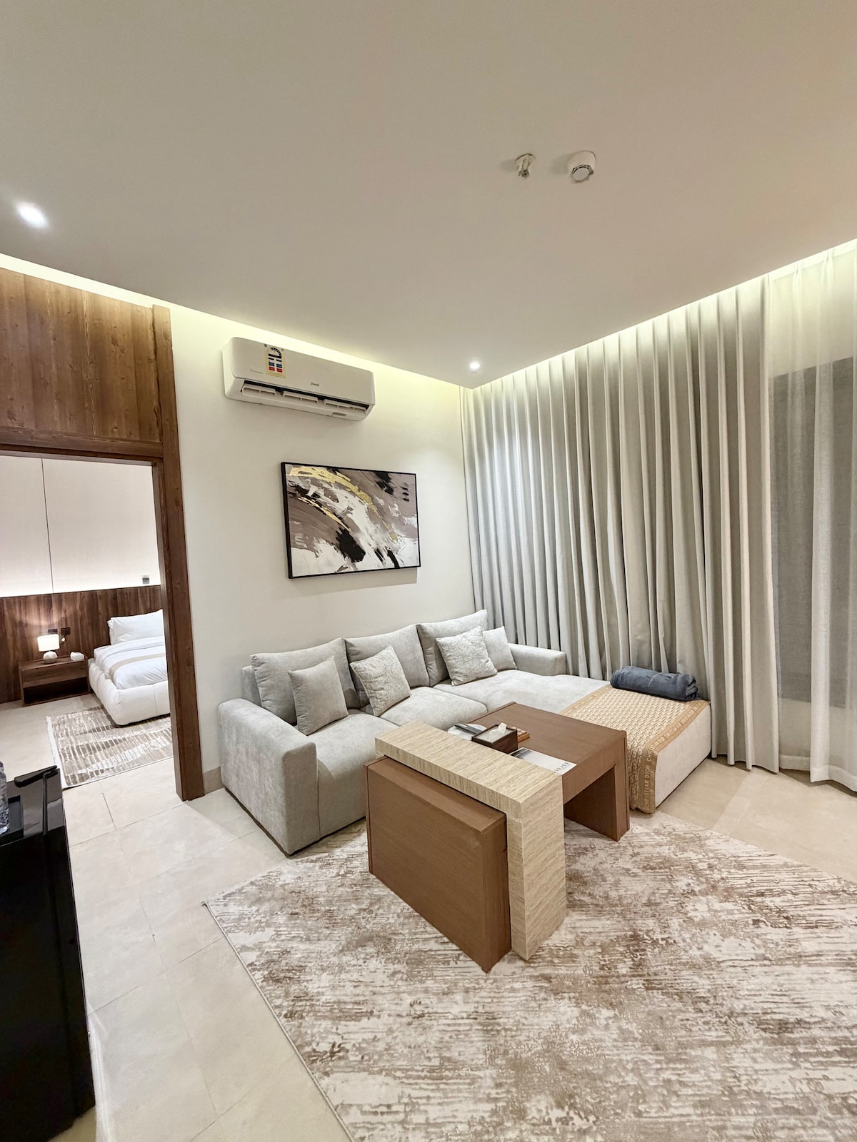 Welcome to our stylish studio apartment in Khobar. This modern space is perfect for solo travelers or couples seeking comfort and entertainment. The studio features a comfortable bed and sofa, a well-equipped coffee corner, a cabinet. Enjoy your favorite shows on the 60" Smart TV, complete with complimentary Netflix access. Whether you're catching up on your favorite series or enjoying a movie night, the entertainment is at your fingertips High speed fiber internet has been installed!