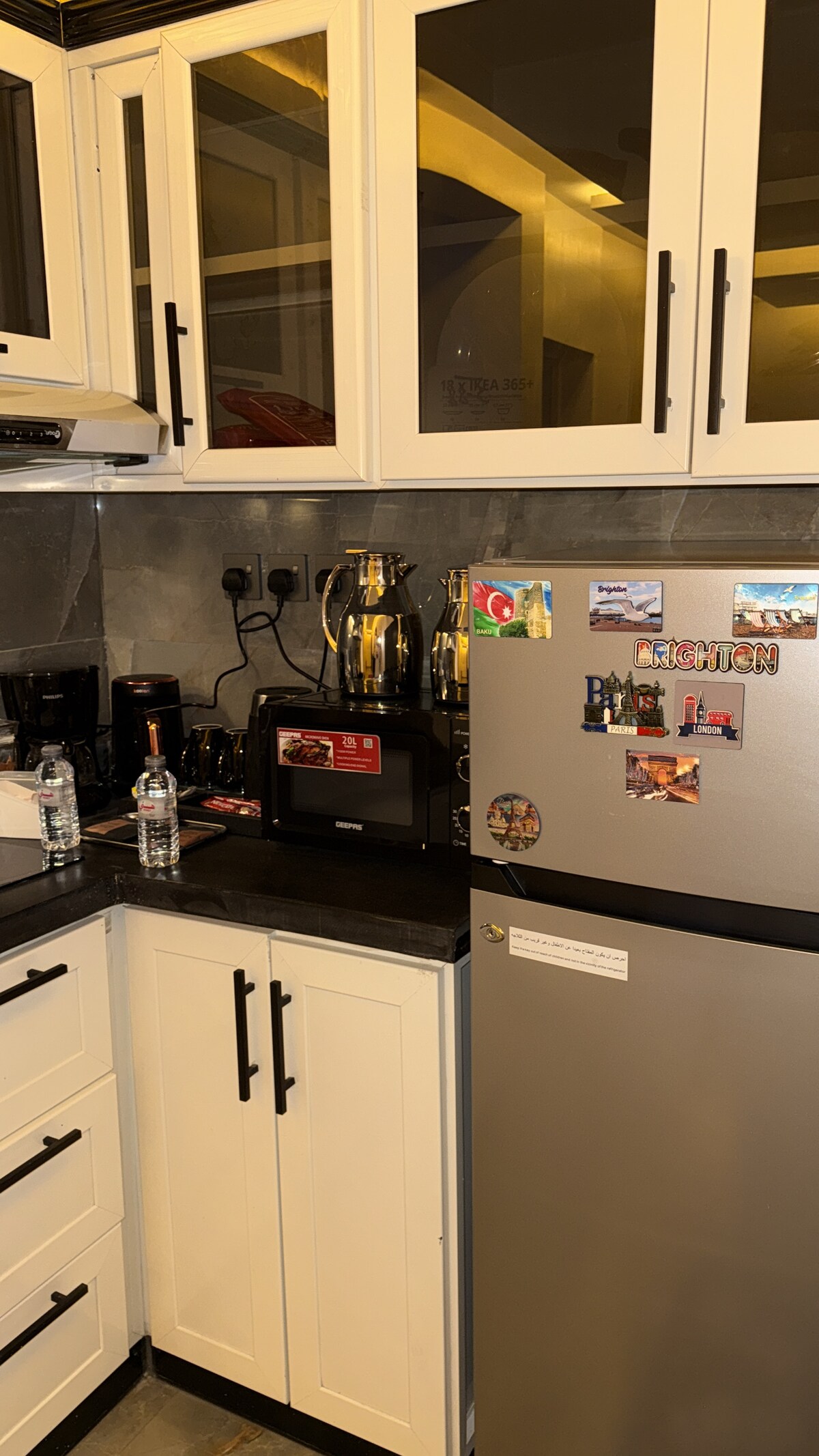 Modernt 1-rumslägenhet i Hittin, ett av Riyadhs bästa lägen, bara några minuter från Boulevard City och de bästa kaféerna. Utformat för komfort och bekvämlighet med självständig incheckning och ett komplett smart system. Här finns ett mysigt vardagsrum, ett bekvämt sovrum, en 85-tums smart-TV och en elegant elkamin för en avkopplande atmosfär. Fullt utrustat kök med ugn, mikrovågsugn, elspis, diskmaskin och tvättmaskin. Rent, elegant och perfekt för par, affärsresenärer och korta eller längre vistelser.