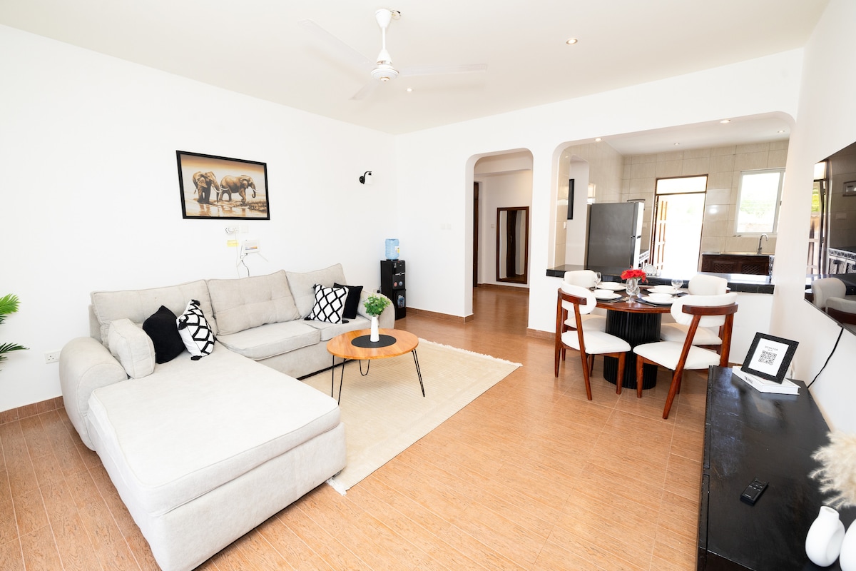 Denna eleganta villa är idealisk för gruppresor, oavsett om det är med vänner eller familj. Villan har tre sovrum och erbjuder moderna öppna bostadsutrymmen prydda med swahili-inredning och möbler från lokala hantverkare. Beläget bara en kort 5 minuters bilresa till stranden och 7 minuters bilresa till butiker och restauranger, erbjuder det både bekvämlighet och charm. Upptäck ditt eget privata tropiska paradis.