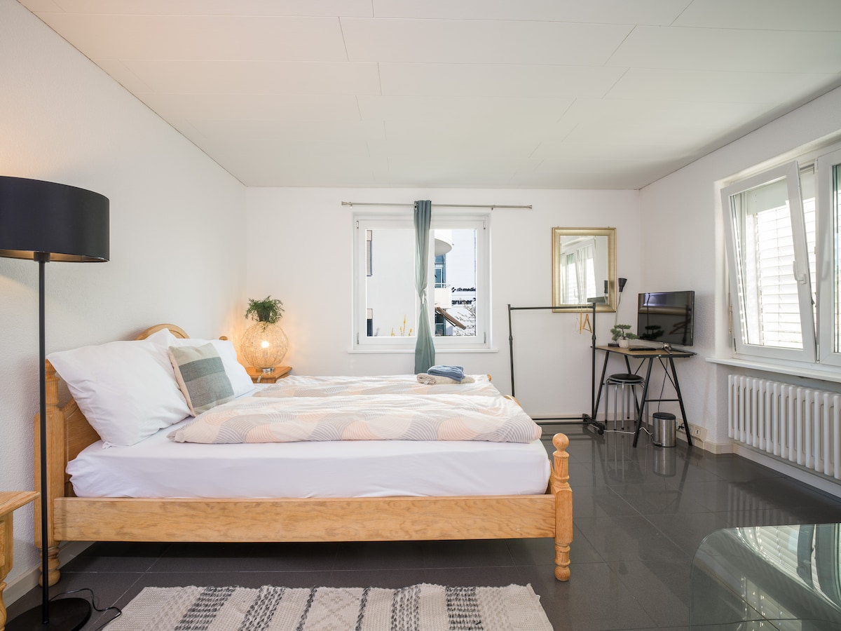 Modern och tyst lägenhet med 1 sovrum (65 m²). Perfekt för affärsresenärer, flytt, par eller små familjer. Höjdpunkter: 🚆 18 minuters direktförbindelse: till Zürichs centralstation och flygplats 💼 Arbetsyta: 10 Gbit/s fiber (ultrasnabbt) 🛌 Dubbelsäng (180x200): + bäddsoffa (190x130) 🧺 Tvätt i boendet: Tvättmaskin, torktumlare och strykset 🍳 Fullt utrustat kök: diskmaskin, Nespresso, WMF, raclette 👶 Familjeutrustning: Spjälsäng, barnstol, badkar och leksaker 📺 Smart-TV: Netflix och YouTube Kids 🛒 Utmärkt läge: Stormarknad (1 minut) och bageri (3 minuter)