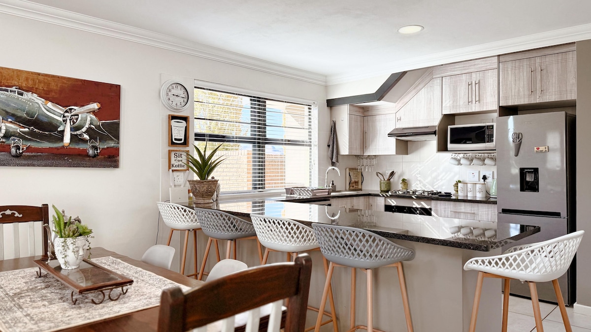 Detta unika boende har en helt egen stil. En sovrumssvit lägenhet ansluten till ett huvudhus med självhushåll. Vardagsrummet värms upp av en vedeldad eldstad och sovrummet har en luftkonditionering. Braai faciliteter på plats samt en Smart-TV med DSTV och WiFi. Två till tre km från centrum, på en bergssida. Det är den nedre nivån av ett trevåningshus men helt privat och påverkas inte av loadshedding.