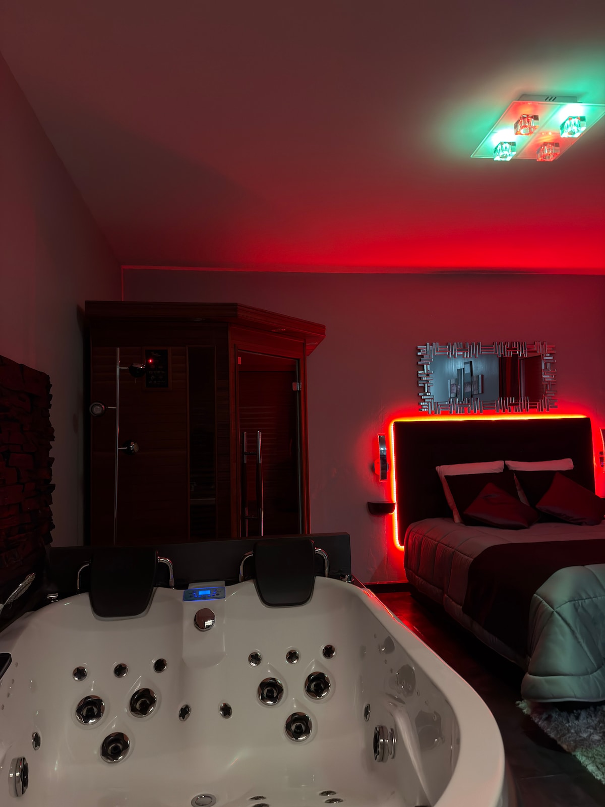 Situé à 10min du centre ville de Dijon, je vous propose de vivre un moment de relaxation et de complicité à deux, dans un cocon minutieusement confectionné pour vous. Un jacuzzi unique avec un confort et un design haut de gamme, un profil anatomique exclusif afin d'optimiser un massage relaxant. Un sauna, un excellent anti-stress qui encourage la détente des muscles et stimule la circulation sanguine. Un lit luxueux, avec un contact enveloppant et un soutien ferme pour une nuit envoûtante.