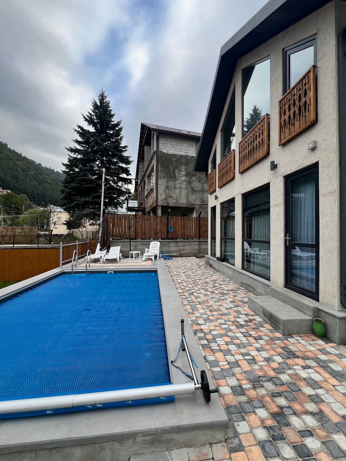 Ha det så kul med din familj i en ny villa nära tallskogen . Allt tillhandahålls för en bra vistelse, ett mysigt hus med öppen spis och en stor terrass med utsikt över bergen och skogen. Rymlig gård med lusthus, grill och tandoor . Köksredskap med redskap i lusthuset. På gården finns ett stort typsnitt som du kan värma upp och njuta av den rena barrluften. Dilijan är känt för sitt milda klimat och sin rena luft. Det är också användbart att andas in Dilijan under perioden för pollinering av tallar med vilken huset helt enkelt är inhägnad.