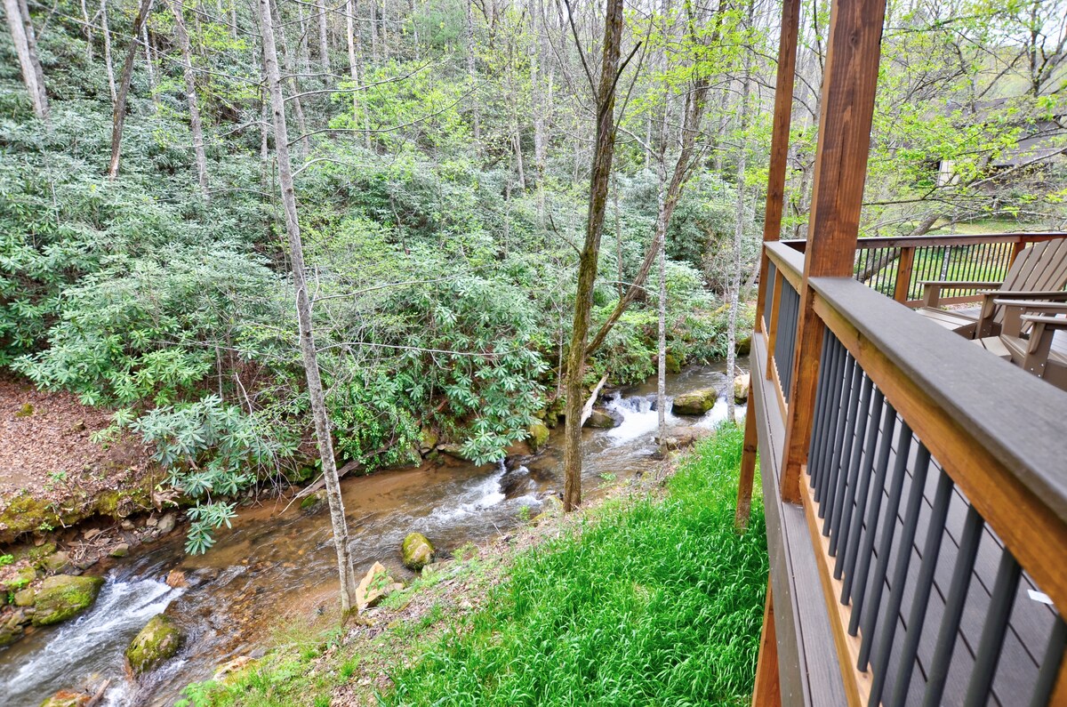 Tuckasegee River House – 4 sovrum/2 badrum/sovplats för 6 personer. Kom så nära vattnet som möjligt! Stor täckt altan med utsikt över älven med bubbelpool under stjärnorna! Koppla av utomhus vid eldgropen vid floden. Öringsfiske i världsklass bara några steg bort. Bara en kort bilresa från centrala Dillsboro & Sylva, 10 minuters bilresa från WCU, 20 minuters bilresa från Great Smoky Mountain Railroad's Polar Express i Bryson City, och 45 minuter från Asheville! Perfekt för fiskare, familjer eller romantiska utflykter!