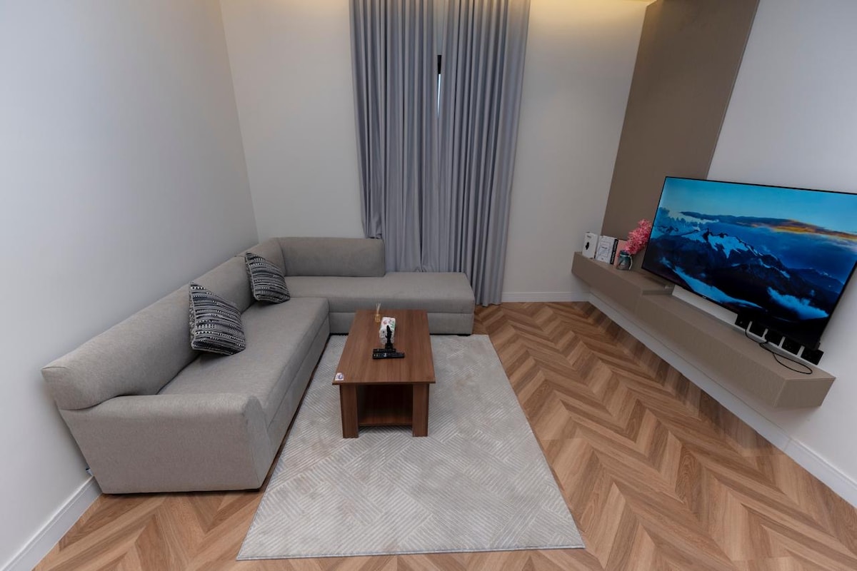 Lyxig lägenhet inbäddad i ett fantastiskt område i ett prestigefyllt grannskap. Njut av hisnande utsikt över trädgården från ditt fönster, fullt utrustat kök, kaffebryggare och en 75" smart-TV. Idealiskt beläget nära de främsta turistattraktionerna och nöjesställena — inklusive Diriyah, Boulevard City, Boulevard World och mycket mer. Sportbanan ligger bara 2 minuters bilresa bort, medan det exklusiva Thagher Complex också ligger bara 2 minuter bort och erbjuder ett brett utbud av restauranger, kaféer och butiker.