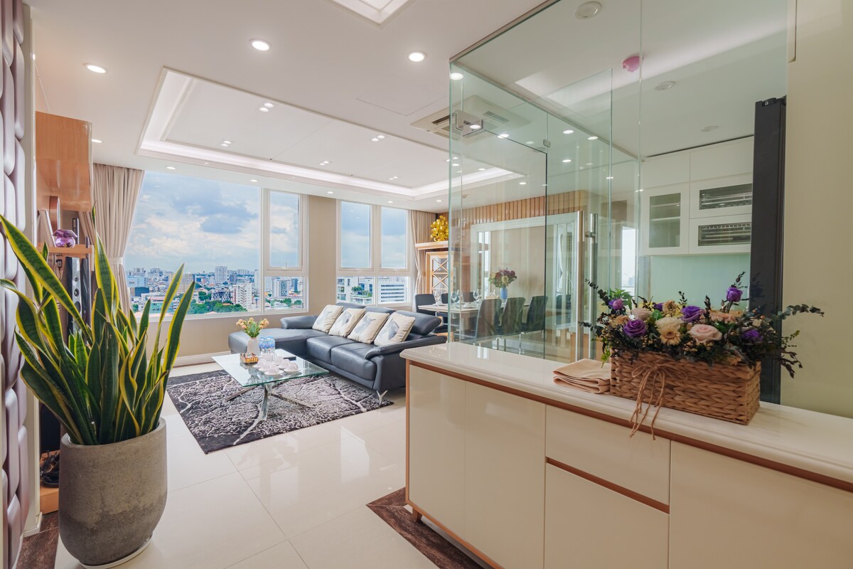 Elevated comfort and style in this luxurious 2-bedroom apartment, perfectly situated on a high floor with sweeping city views. Located near District 1, you're just minutes away from most iconic landmarks, including Ben Thanh Market, Notre-Dame Cathedral, Independence Palace,.. The apartment offers a quiet and peaceful retreat, perfect for families or groups of up to 4. It features 2 spacious king-size beds with high-end mattresses, complemented by elegant furniture and sleek modern appliances.