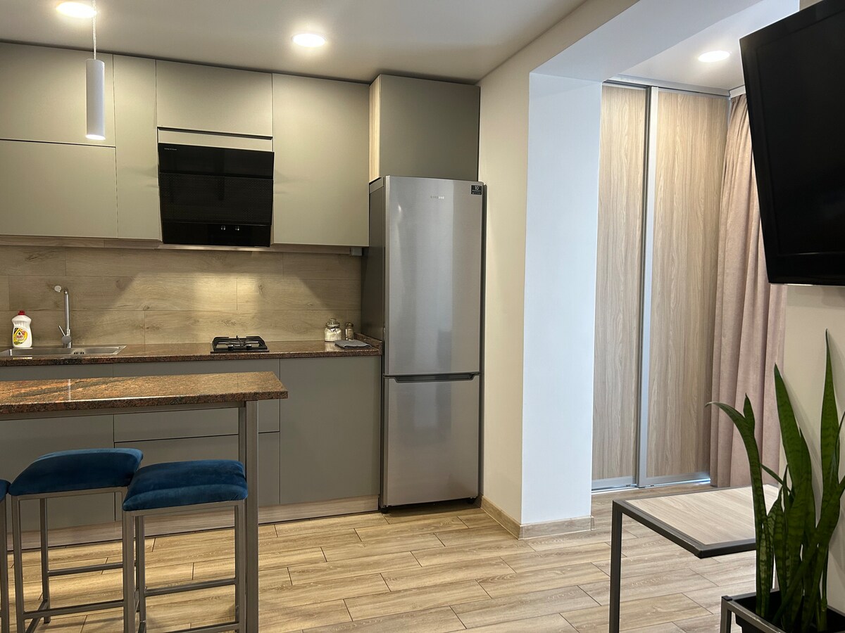 Green studio apartment is situated in the heart of Dnipro city The apartment is on the last 9th floor and the size is about 35 m2 The ceiling height is more than 3 meters, that is why the apartment looks spacious. Soft comfortable bed, fully equipped kitchen including a washing machine and microwave. The brand new and latest QLED model of Samsung smart tv. The bathroom has a shower and separate toilet room.