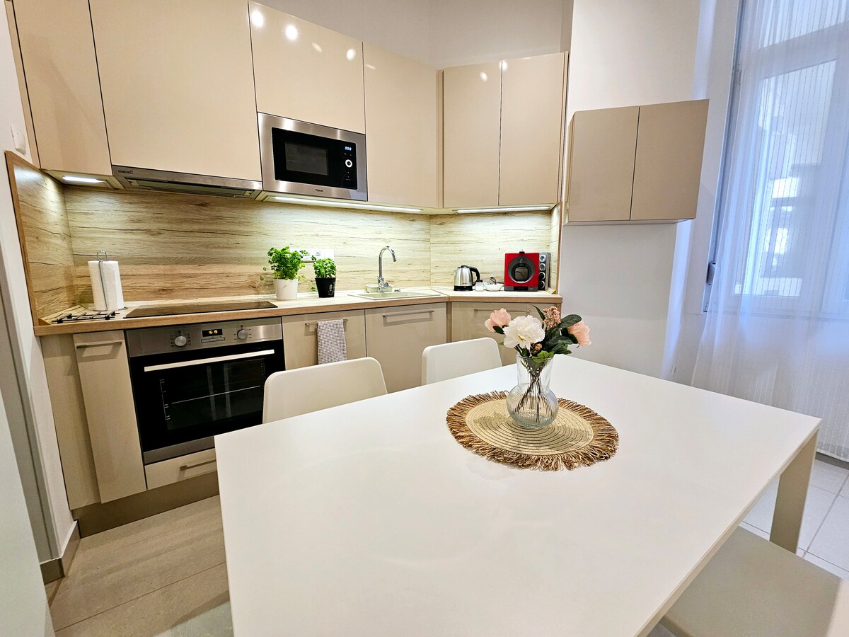Kära gäster, Välkommen till mitt härliga, helt nya boende, beläget i centrum av Budapests mest besökta och vackraste modegata. Tunnelbana (linje 3-4), bussar, Gozsdu partyplats, kända ungerska restauranger ligger bara några minuter från vår lägenhet. Byggnaden är nybyggd, hiss, bastu, gym är också tillgängligt gratis för gäster och hyresgäster. Lägenheten är fullt utrustad, rökning endast på balkongen, mörkläggningsgardiner.