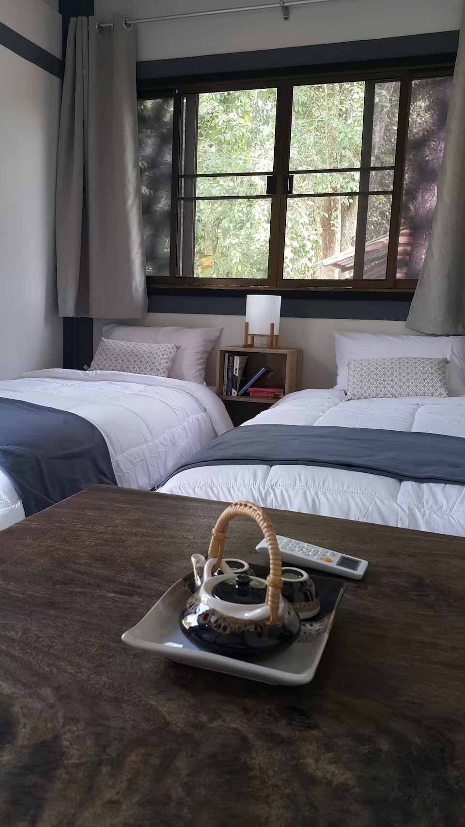 150 kvadratmeter , 2 sovrum , två dubbelsängar , 1 vardagsrum , eget badrum med dusch , balkong med vacker utsikt över trädgården,risfält , gratis kaffe ,te ,flaskvatten varje dag , kylskåp, TV, schampo , duschtvål , hårbalsam, kam, duschmössa, tandborste, rakapparat och så vidare , böcker , gratis wifi , badrock , duschtofflor rumsrengöring varje dag