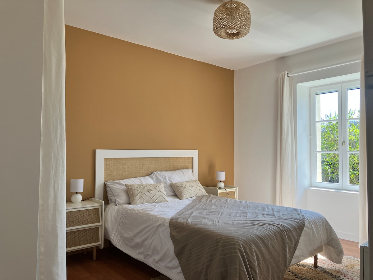 90 m² annex i anslutning till huvudbostaden: • Bottenvåning: 45 m² stort vardagsrum med kök och allrum (bäddsoffa). • Våning: 2 rymliga sovrum, var och en med eget duschrum och separat toalett: - Terra Cotta-rum: Dubbelsäng (140 cm). - Blått rum: Dubbelsäng (180 cm) eller 2 enkelsängar (90 cm) + enkelsäng (80 cm). Utomhus: Säker pool (6 m × 12 m), öppen från maj till september. Boendet är inte tillgängligt för personer med nedsatt rörlighet.