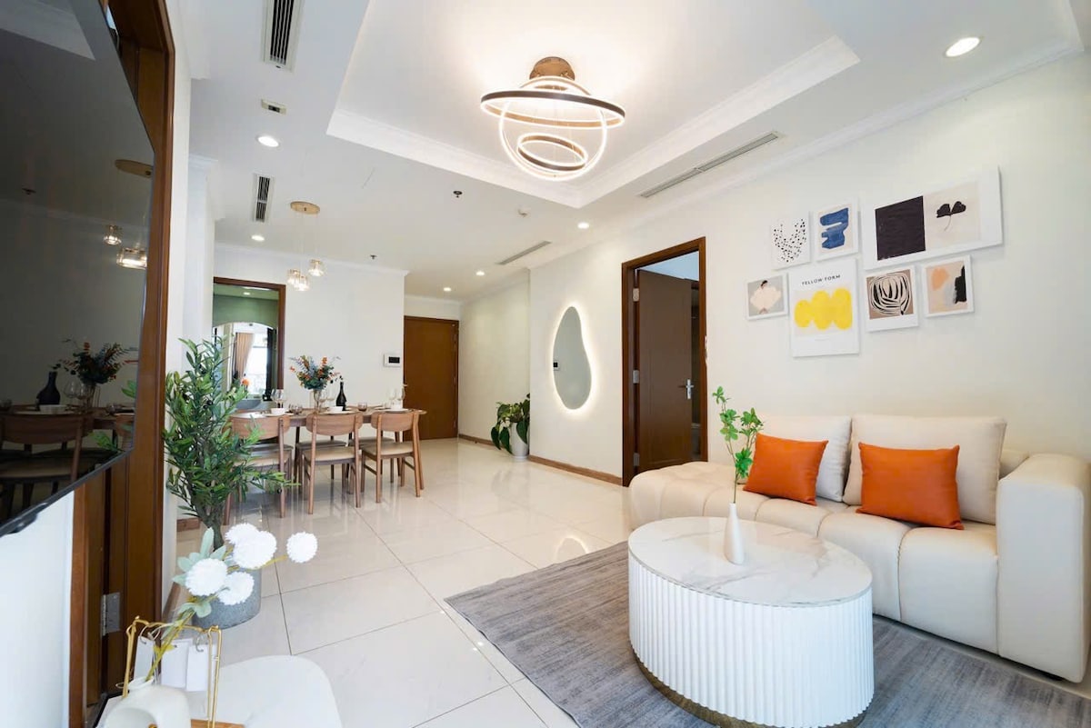 Detta speciella ställe ligger nära till allt, vilket gör det enkelt att planera din rundtur. Åk var som helst i närheten när din familj bor i detta centrala läge - bredvid Landmark 81. Denna lägenhet med 2 sovrum ligger på 34:e våningen, är rymlig och luftig och har en fantastisk utsikt över staden – perfekt för att njuta av kvällslandskapet och titta på fyrverkerier vid speciella tillfällen. Lägenheten är elegant inredd i en övervägande skandinavisk stil, men med en subtil blandning av modernt och inslag av Japandi.