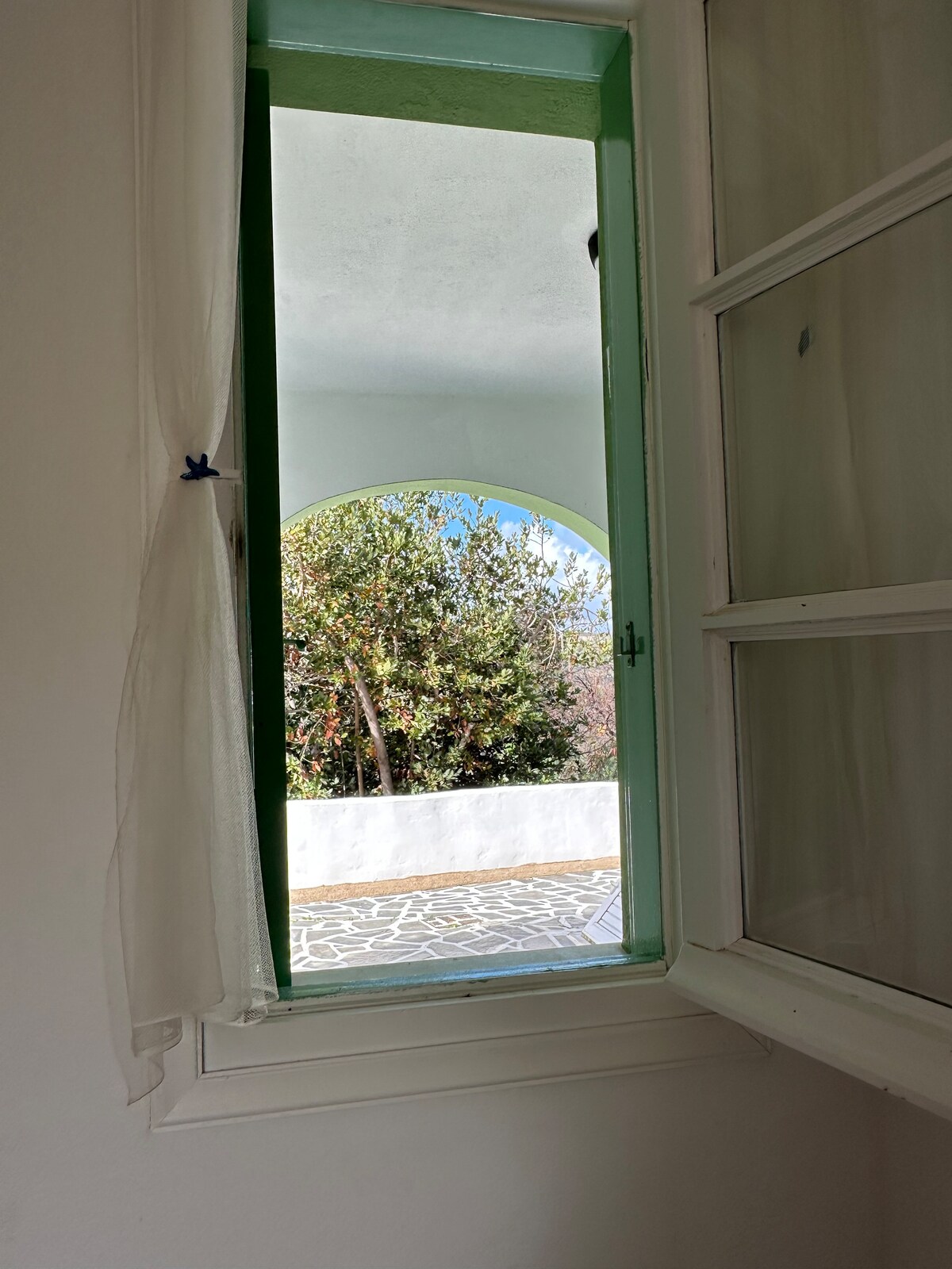 Det är ett traditionellt kykladiskt hus på första våningen, fristående med egna stora veranda med utsikt över havet och underbara solnedgångar. Det ligger på ett mycket lugnt ställe som ligger tio minuters promenad från byn. (Cementväg, upplyst). Kök för matlagning och stor vask utomhus. På ena verandan finns en dubbelsäng för att sola eller för att sova omfamnad av... stjärnorna!!!!!!