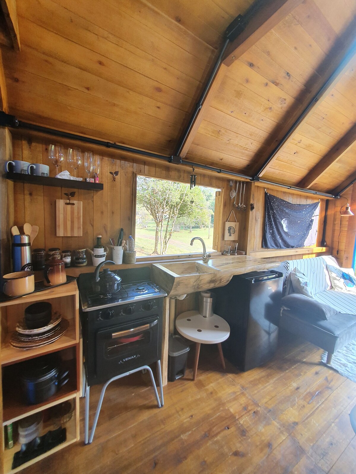 Stugan @oranchodacolina har: Fullt utrustat kök, mikrovågsugn, elektrisk ugn, mixer, brödrost och luftfritös. Vi erbjuder också väsentligheter som salt, socker, olivolja. Dubbelsängen är superbekväm med sängkläder och badhanddukar av högsta kvalitet. Luftkonditionering med värme och kyla, vilket ger termisk komfort under alla årstider. Badkar med badsalt. Och i badrummet, gasuppvärmd dusch och kranar med vacker utsikt över naturen.
