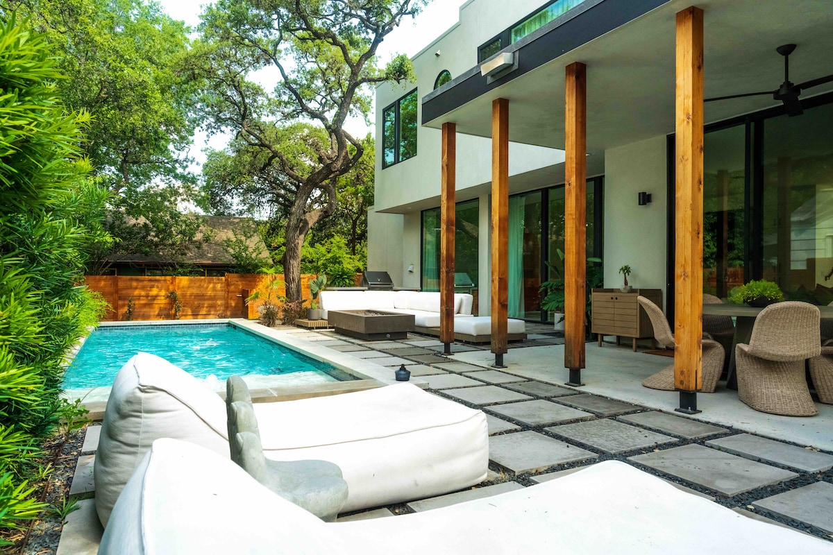 Njut av en elegant upplevelse i detta centralt belägna hem, omgiven av fridfull grönska och en flod bäck på bakgården. Denna Modern Homes Tour-kandidat är en symbol för lyx och svalka Austin. Nyligen ombyggd med alla nya möbler. Inomhusunderhållning med 86" TV och fåtölj soffa, pingis, gym, 2 arbetsstationer, dubbla däck, premium apparater, uteplats och grill för underhållning. Inga grannar bakom. 10 minuter till centrum och flygplatsen! ** eldstaden fungerar inte **