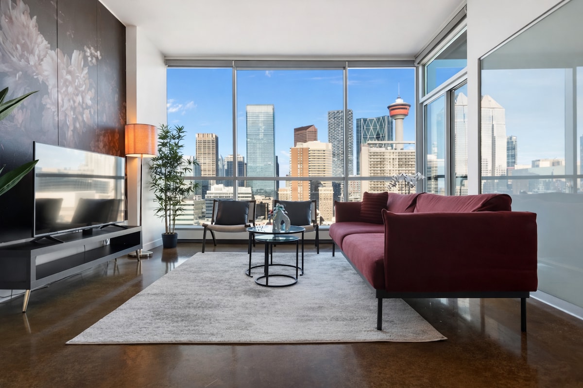 Välkommen till vår fantastiska lägenhet i centrala Calgary! Denna moderna tillflyktsort erbjuder dig den perfekta kombinationen av bekvämlighet, lyx och hisnande utsikt. När du kliver in kommer du omedelbart att fängslas av fönstren från golv till tak som visar den fantastiska stadssilhuetten och majestätiska bergsutsikt. Observera att byggnadens ytterdörrar är 22:00. Om du bokar måste du hämta nyckeln/fob på en annan plats. *** POOLEN är stängd för vintern.