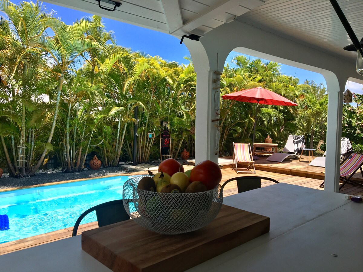 Vacker fristående villa öppen till utsidan utrustad för 8 personer i en sluten tropisk trädgård med stor saltpool. Mysigt och tropiskt inrett hus där alla kommer att hitta sin plats i fullständig avskildhet. Njut av dess 4 luftkonditionerade sovrum med utsikt över utsidan, dess 4 duschrum, dess öppna kök och dess utomhusplancha/barområde. Lugnt område 5 minuters bilresa till St François och dess stränder, golf, flygfält, kitesurfing, dykklubb.