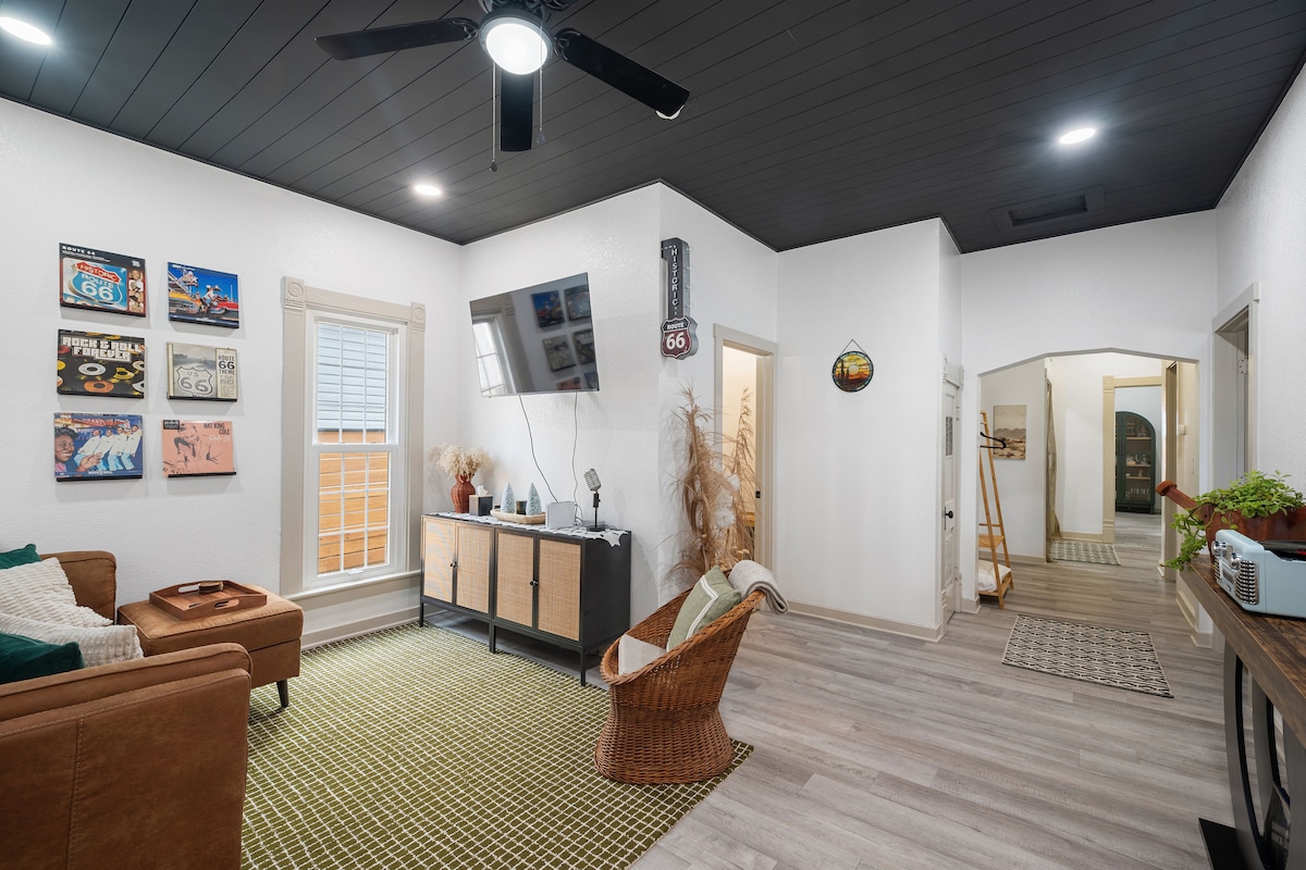 Ofläckat boende på en av Joplins vackraste landmärkesgator, välskötta boenden i alla riktningar av detta nyrenoverade boende! Stil och komfort var i fokus. USB/pluggar vid varje säng, dimbara och fjärrstyrda fläktar i varje sovrum bidrar till din bekvämlighet. Högkvalitativa lakan och kylande madrassdynor för en bra natts sömn. Eldstaden kan sprakande och brinna med eller utan värme, så att du kan känna dig mysig även när det är varmt ute. Köket är perfekt och välfyllt med allt du behöver.