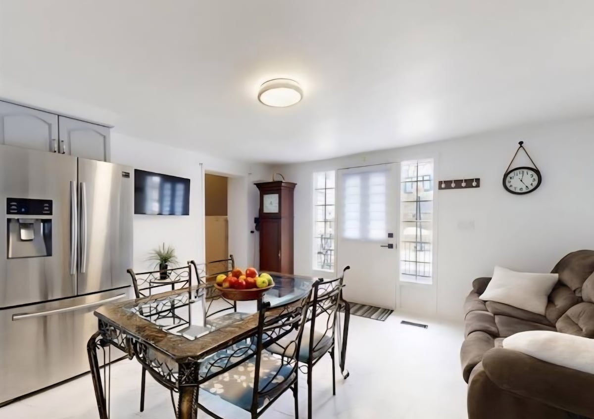 Beautiful inviting space for families as well as individuals. Brand New Fully renovated area with lots of amenities for the whole family. 2 Great size bedroom with queen size beds. Jack And Jill full washroom with an amazing shower that boast body jets. Comes with all the bells and whistles. Open concept with Living room, Dining room, Full Kitchen, Washer and Dryer, free parking, work area ideal for remote work, and lots more…. NO UNREGISTERED GUESTS ARE ALLOWED AS PER HOUSE RULES.