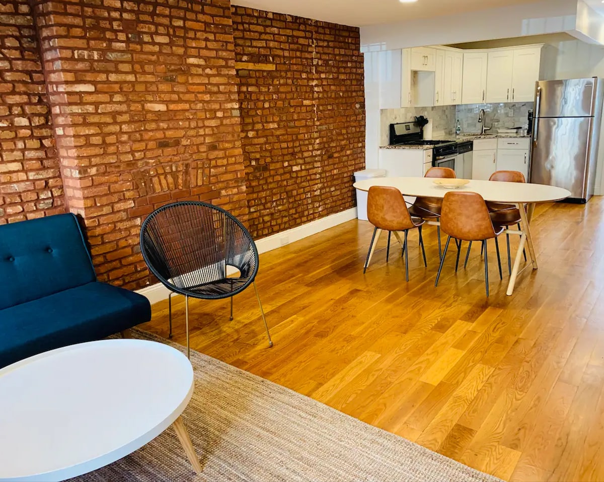 Njut av fullständig avskildhet under din vistelse på bottenvåningen i vårt Windsor Terrace townhome – rymmer upp till 4 personer med queensize-säng, bäddsoffa och barnsäng. Industriella vibbar med tegelväggar, fullt utrustat kök (endast lätt matlagning), LG Smart TV (Netflix/Apple TV), höghastighets-WiFi, luftkonditionering, värmare och avfuktare. Djurvänligt. Steg till Prospect Park, lokala pärlor som Krupa Grocery & farmers markets. 5 minuters promenad till tunnelbanan F/G; 30-35 min till Financial District, 40-45 min till Midtown. Gratis parkering. Självständig incheckning. Lugn bostads oas!