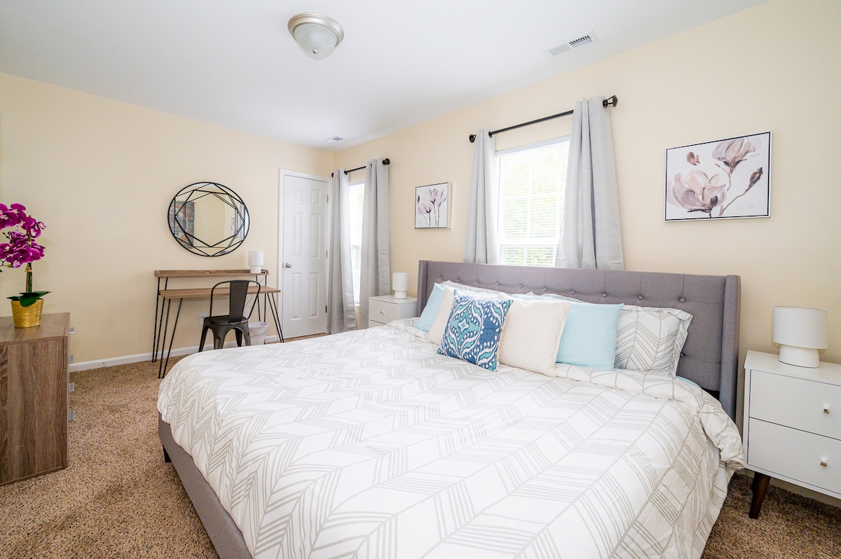 Ett charmigt radhus i en våning inbäddat i ett lugnt grannskap, som erbjuder den perfekta blandningen av komfort och mysighet. En fristad för resande sjuksköterskor (nära Duke Hospitals/andra medicinska anläggningar), resande yrkesverksamma och flyttbehov. Levereras fullt utrustad med alla nya rostfria vitvaror och köksredskap. Sovrum möblerade med dubbelsängar, mörkläggningsgardiner och smarta TV-apparater. Arbetsstation med bildskärm för att stödja dina behov av bärbar dator. Snabb åtkomst till större motorvägar och sevärdheter.