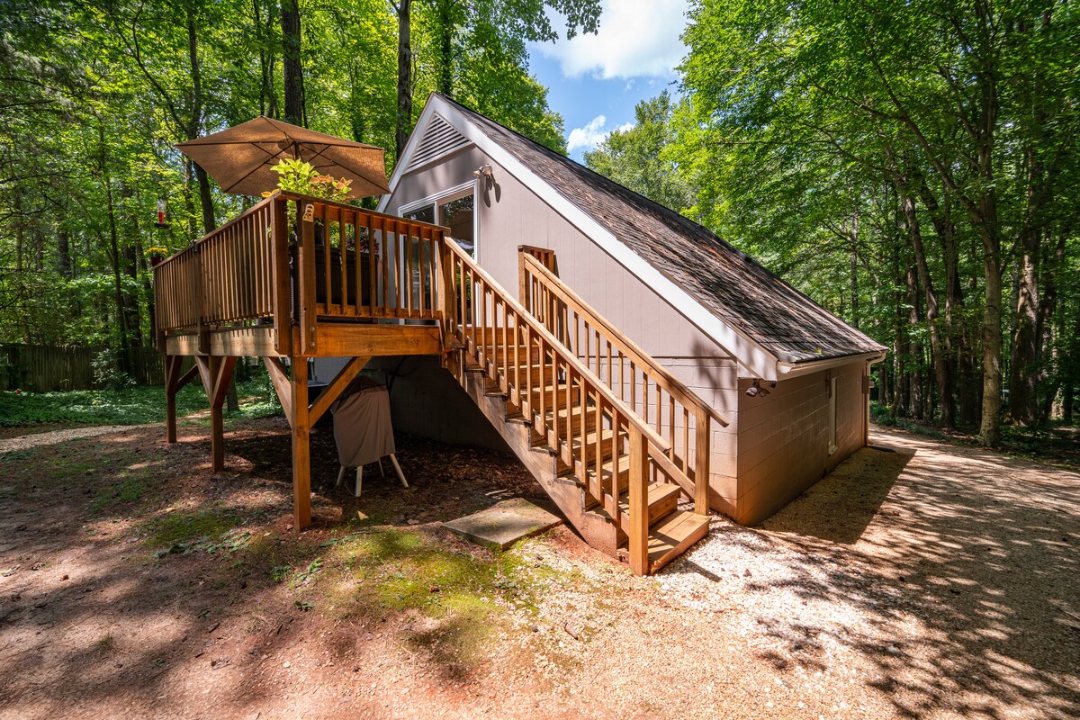 Välkommen! Vår moderna svit erbjuder en mysig säng-n-bad kombo med privat ingång från däcket. Titta på Netflix på TV från minnesskumsängen, förvara rester i minikylskåpet och vakna till Keurig-kaffe på morgonen! Gigabit fiberinternet och privat elektrisk luftaggregat också. Vi ligger i ett lugnt, skogigt grannskap nära "Crossroads" av US-1 och I-40, bara en kort bilresa till någonstans i Triangeln. Vi ser fram emot att vara värd för dig! (Läs hela reglerna och beskrivningen.)