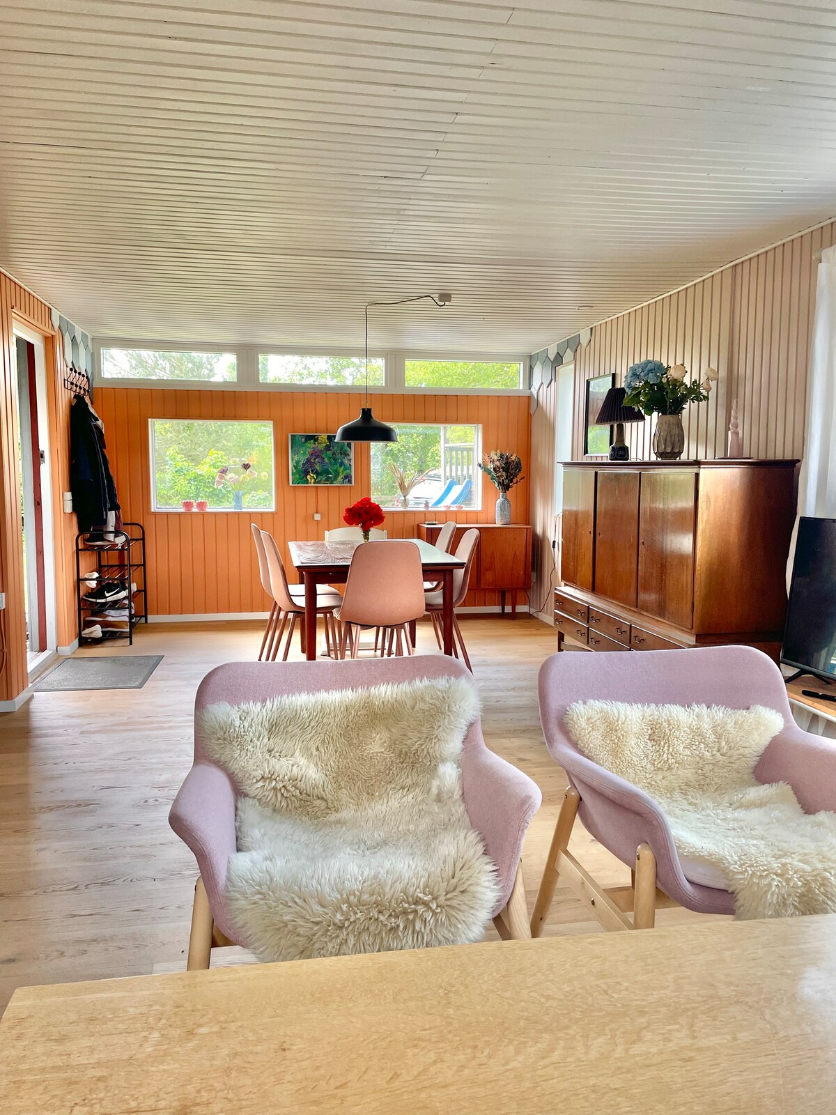 Koppla av med hela familjen i detta fridfulla hem. Stort härligt utomhusspa för dig som behöver avkoppling. Loungemöbler på terrassen med riktigt mysig utomhus öppen spis i hörnet av terrassen. Efter en promenad vid stranden, som ligger 300 meter bort, är det skönt att lysa upp eldugnen i vardagsrummet och koppla av på den stora mjuka soffan. Det finns ett gunga kvar längst ner på trädgården. Bålplats finns också i trädgården. Täckt ingång. Och en täckt terrass där det finns en gasolgrill och kolgrill.