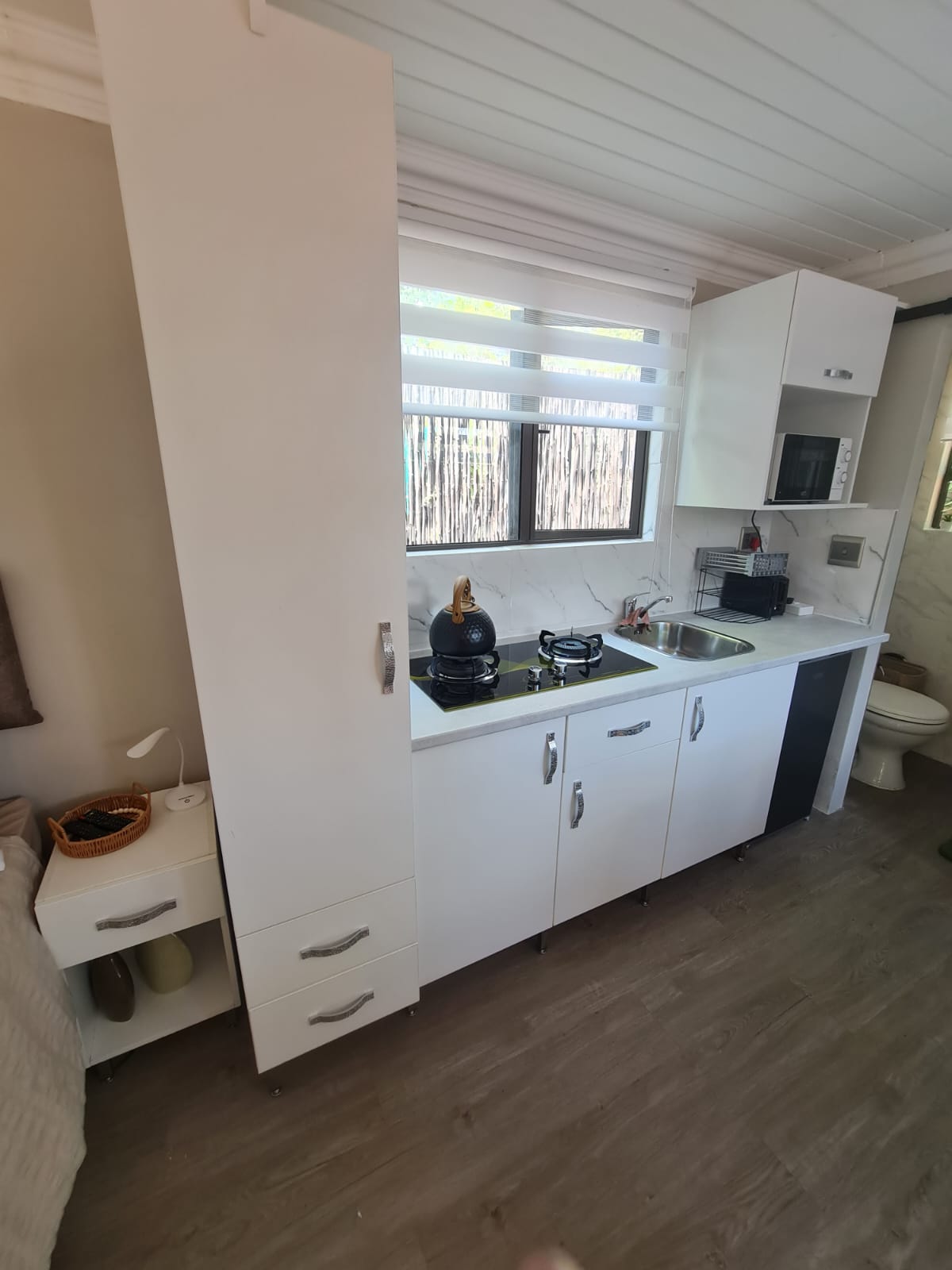 Mysig 6m container i ungkarlsstil med en dubbelsäng, gott om förvaring, fullt utrustad kokvrå med barkylskåp och ett privat braai-område för avslappnade kvällar. Ljusslingor skapar en romantisk atmosfär på kvällen. Njut av streaming på platt-TV, gratis Wi-Fi och solenergi så att du håller kontakten under strömavbrott. Lugnt och fridfullt — ingen hög musik eller fester. Självhushåll med fullständig integritet, men vi finns alltid bara ett samtal bort om du behöver något.