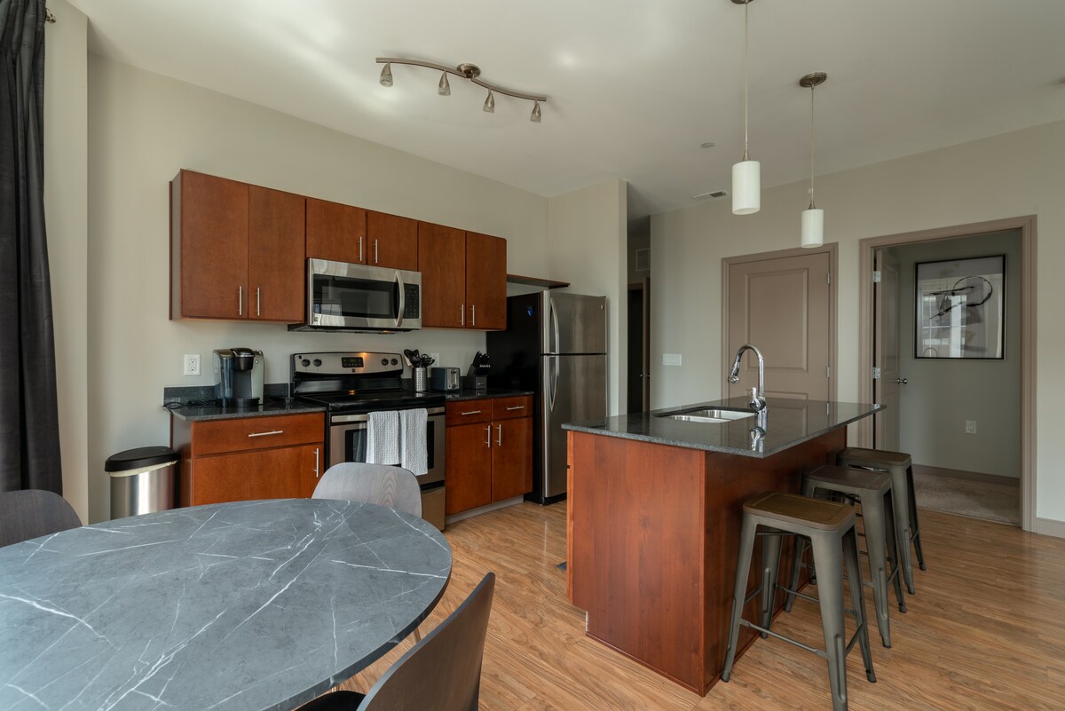 En stadsretreat som välkomnar dig med ett mjukt sken och ett visst leende. Detta utrymme är fullt av naturligt ljus och har varma neutrala färger med mjuka läderdetaljer. Det blandar tyst elegans med enkelhet – rent, mysigt och tidlöst. Tänk långsamma morgnar, färskt kaffe och den typ av skönhet som dröjer kvar. Denna lägenhet ligger inbäddad i en boutiquebyggnad i Columbus Italian Village och handlar om modern komfort med en lätt touch. Okomplicerad, graciös och precis som hemma.