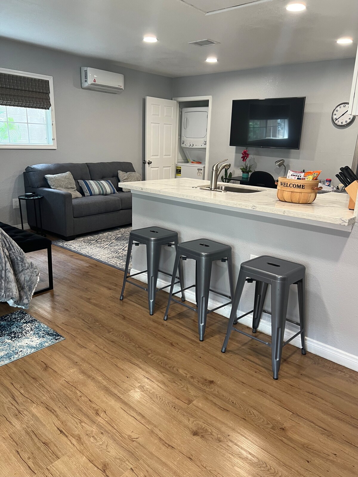 Ta en paus och varva ner i vår kustinspirerade oas. Njut av en avslappnad cabana-vibb med bra naturligt ljus i ett lugnt grannskap. Denna nybyggda privata svit har alla nya apparater, möbler och armaturer. Du har allt du behöver för att känna dig som hemma med ett fullt fungerande kök, eget badrum och staplad tvättmaskin/torktumlare. Den har en bekväm arbetsyta med laddningsportar och en liggande loveseat tillsammans med en helt ny gelminnesskum queen-säng.