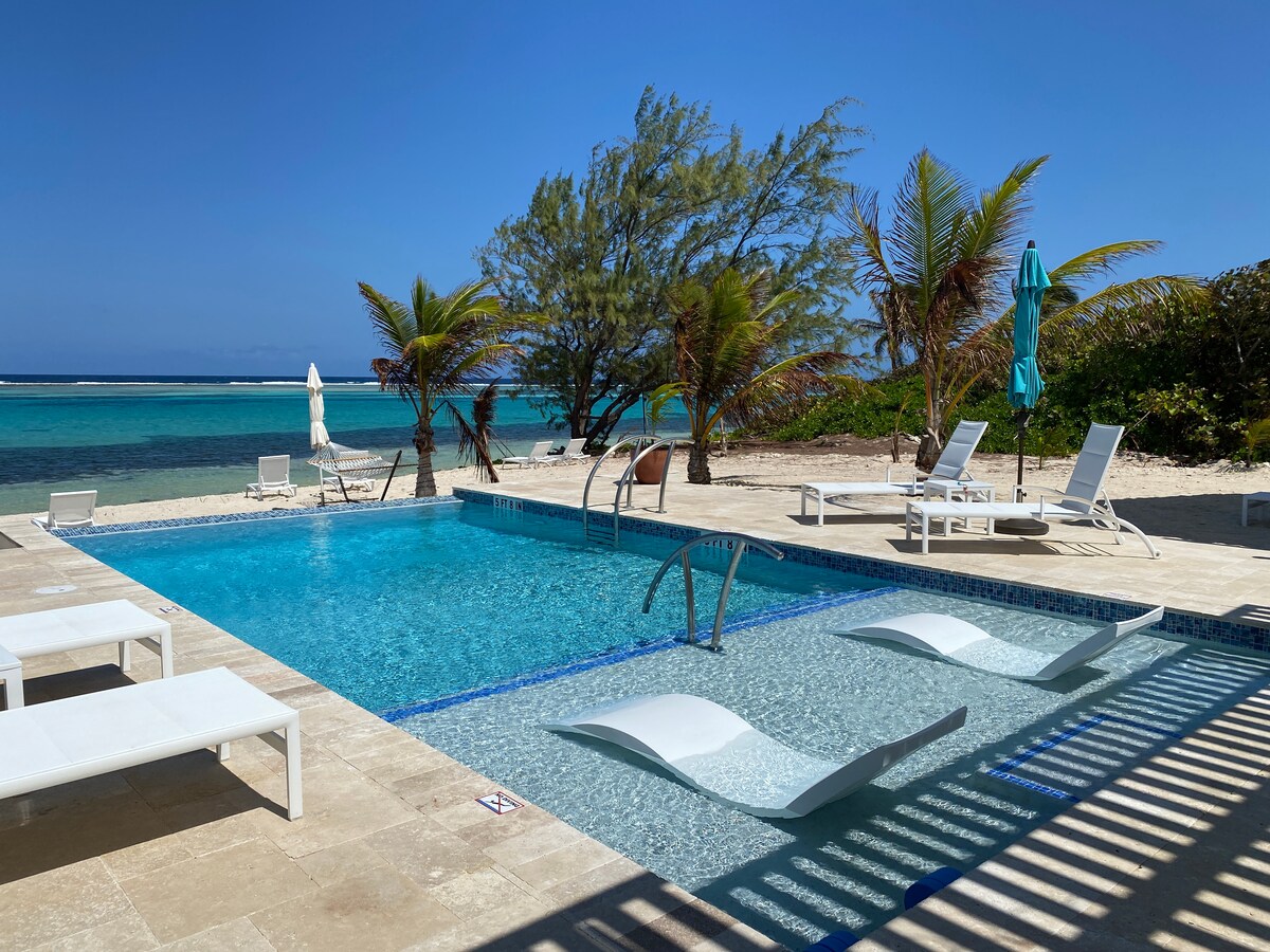 Privat och lugn stuga VID STRANDEN erbjuder alla bekvämligheter som ett lyxboende. KAJAKER och SNORKELUTRUSTNING, dagbädd och smart TV på den SKÄRMADE VERANDAN, strandstolar, strandgunga och vackra SOLNEDGÅNGAR. Hängmattor finns i hela boendet. Modern duschkabin, handdukar och badrock. Fullt utrustat kök, Keurig och vanlig kaffebryggare och mixer, extra stort sovrum, karibisk antik fyrpelarsäng, skrivbord + smart-TV. Njut av paradiset och upplev "True Caymanian Hospitality!!"