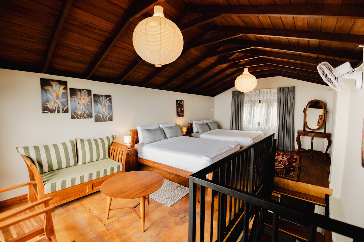 Den övre delen av villan har egen ingång som ger dig ditt utrymme och avskildhet under din semester. Övre villa består av 3 rum, där svitrummet har 2 sovrum som delar svitbadrummet. Det lyxiga sovrummet med en balkong som vetter mot paddy-fälten kommer garanterat att göra din vistelse minnesvärd. Det stora sovrummet kommer också med ett bifogat rum med en enkelsäng vilket gör det idealiskt för en familj på 4 att bo tillsammans. Det finns egen balkong och ett skafferi.