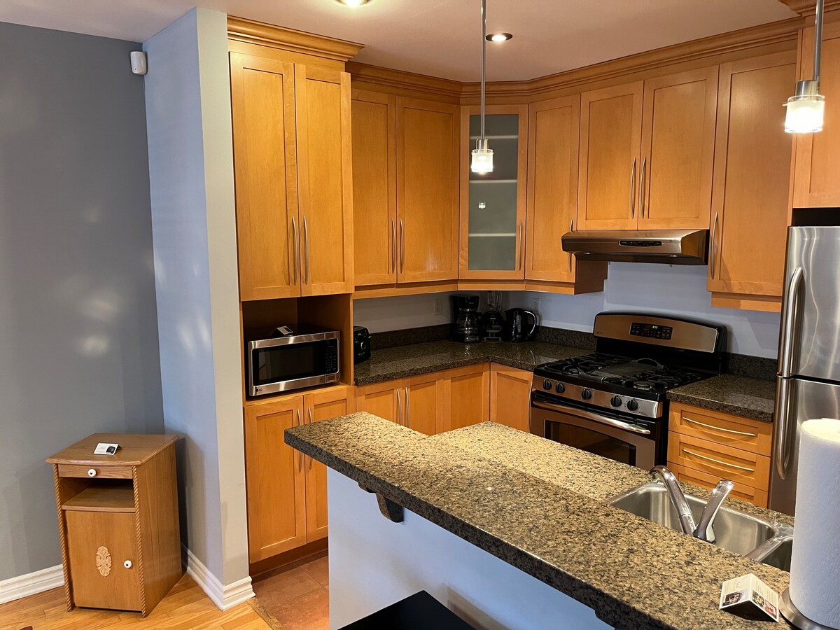🛏️ Sov som en dröm – Plysch queen-size säng med sängkläder av hotellkvalitet. Vila lugnt efter att ha utforskat Montreal. 📺 Netflix & Chill Ready – Smart-TV med streamingappar. 🚿 Modernt och fläckfritt badrum – 🍳 Fullt utrustat kök – Spara $$ på att äta ute! Laga mat som ett proffs med alla väsentligheter. 🚗 SÄLLSYNT FYND: GRATIS parkering! – Parkera GRATIS. 🚀 Arbete och lek – Höghastighets WiFi + dedikerad arbetsyta för digitala nomader. ✅ 14 minuter till Downtown Montreal – Perfekt för konserter, festivaler, nattliv!